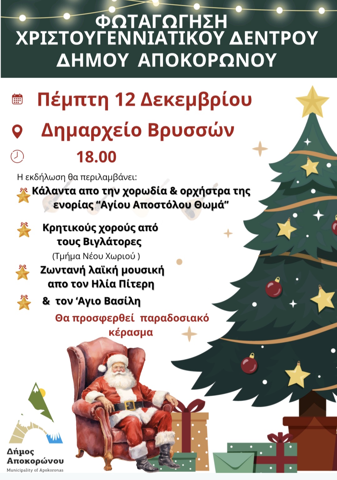 Tην Πέμπτη 12 Δεκεμβρίου θα πραγματοποιηθεί η φωταγώγηση του Χριστουγεννιάτικου δέντρου του δήμου Αποκορώνου, στις 18:00 , στο Δημαρχείο Αποκορώνου στις Βρύσες.