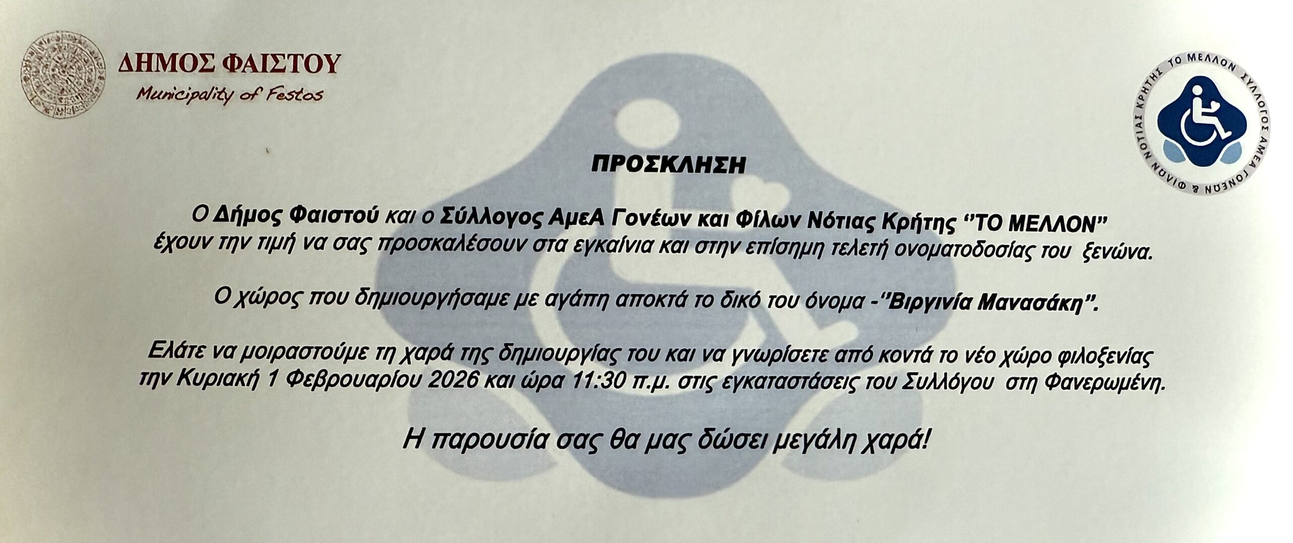 “Ο Δήμος Φαιστού και ο Σύλλογος ΑμεΑ Γονέων και Φίλων Νότιας Κρήτης «ΤΟ ΜΕΛΛΟΝ», έχουν την τιμή να σας προσκαλέσουν στα εγκαίνια και την επίσημη τελετή ονοματοδοσίας του ξενώνα φιλοξενίας ΑμεΑ.