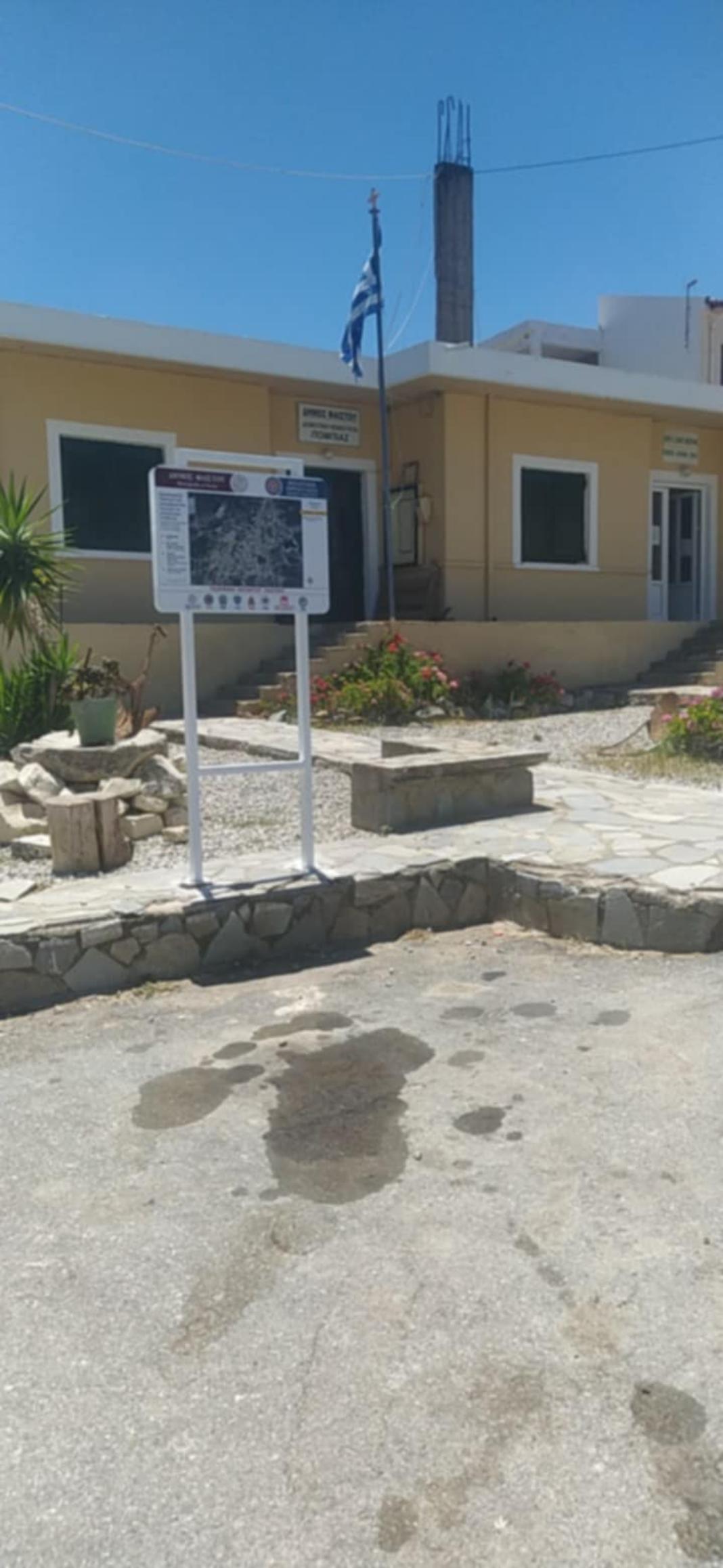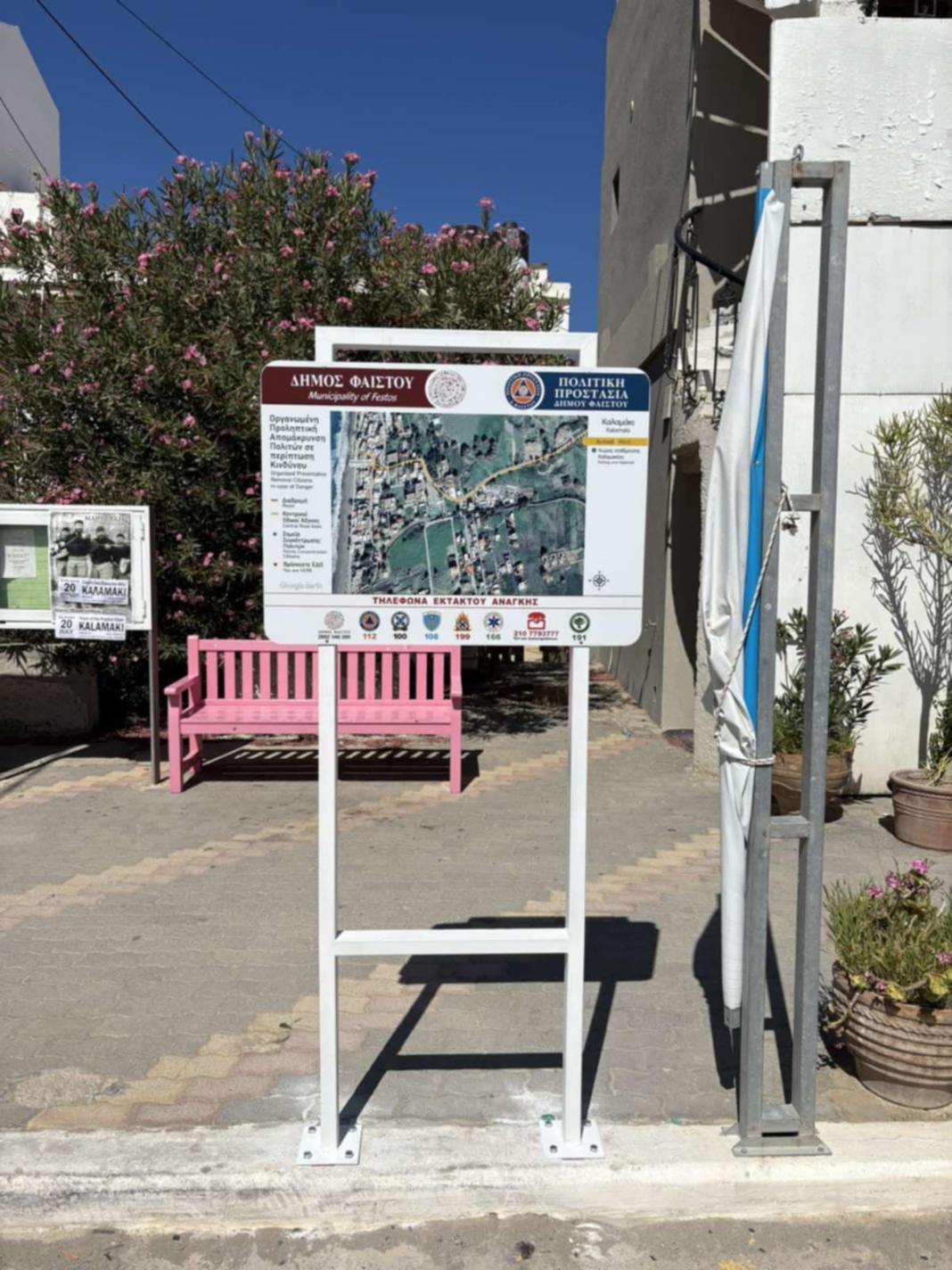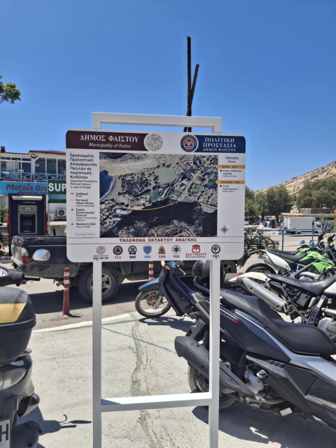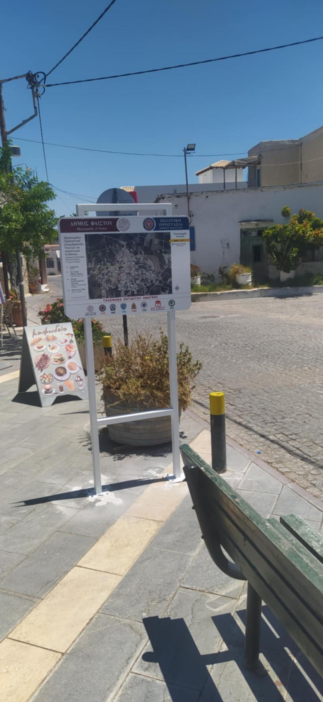 Το ολοκληρωμένο σχέδιο έχει αποτυπωθεί επί χάρτου και περιλαμβάνει σαφείς οδηγίες για την έγκαιρη και ασφαλή αντίδραση των πολιτών. Ήδη έχουν τοποθετηθεί πινακίδες στις τρεις βασικές δημοτικές ενότητες, ενώ νέες πινακίδες προστέθηκαν πρόσφατα σε τοπικές κοινότητες και οικισμούς των Δημοτικών Ενοτήτων του Δήμου Φαιστού και συγκεκριμένα στις εξής περιοχές: