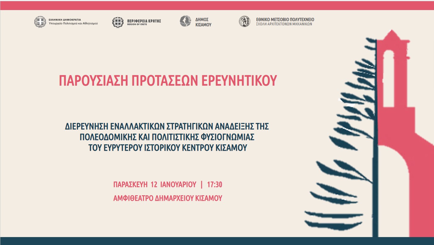 Ο Δήμος Κισσάμου, σε συνεργασία με το Υπουργείο Πολιτισμού, την Περιφέρεια Κρήτης και το Εθνικό Μετσόβιο Πολυτεχνείο, σας προσκαλούν στη Δημόσια Παρουσίαση των αποτελεσμάτων του Ερευνητικού Προγράμματος: «ΔΙΕΡΕΥΝΗΣΗ ΕΝΑΛΛΑΚΤΙΚΩΝ ΣΤΡΑΤΗΓΙΚΩΝ ΑΝΑΔΕΙΞΗΣ ΤΗΣ ΠΟΛΕΟΔΟΜΙΚΗΣ ΚΑΙ ΠΟΛΙΤΙΣΤΙΚΗΣ ΦΥΣΙΟΓΝΩΜΙΑΣ ΤΟΥ ΕΥΡΥΤΕΡΟΥ ΙΣΤΟΡΙΚΟΥ ΚΕΝΤΡΟΥ ΚΙΣΣΑΜΟΥ» που θα πραγματοποιηθεί την Παρασκευή 12 Ιανουαρίου 2024 και ώρα 17.30 στο Αμφιθέατρο του Δημαρχείου Κισσάμου.