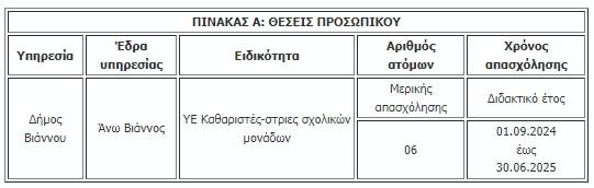 Ανακοινώνει την πρόσληψη, με σύμβαση εργασίας ιδιωτικού δικαίου ορισμένου χρόνου, συνολικά έξι (06) ατόμων για την καθαριότητα σχολικών μονάδων στο Δήμο Βιάννου και συγκεκριμένα, ανά υπηρεσία, έδρα, ειδικότητα και διάρκεια σύμβασης, αριθμού ατόμων (βλ. ΠΙΝΑΚΑ Α):