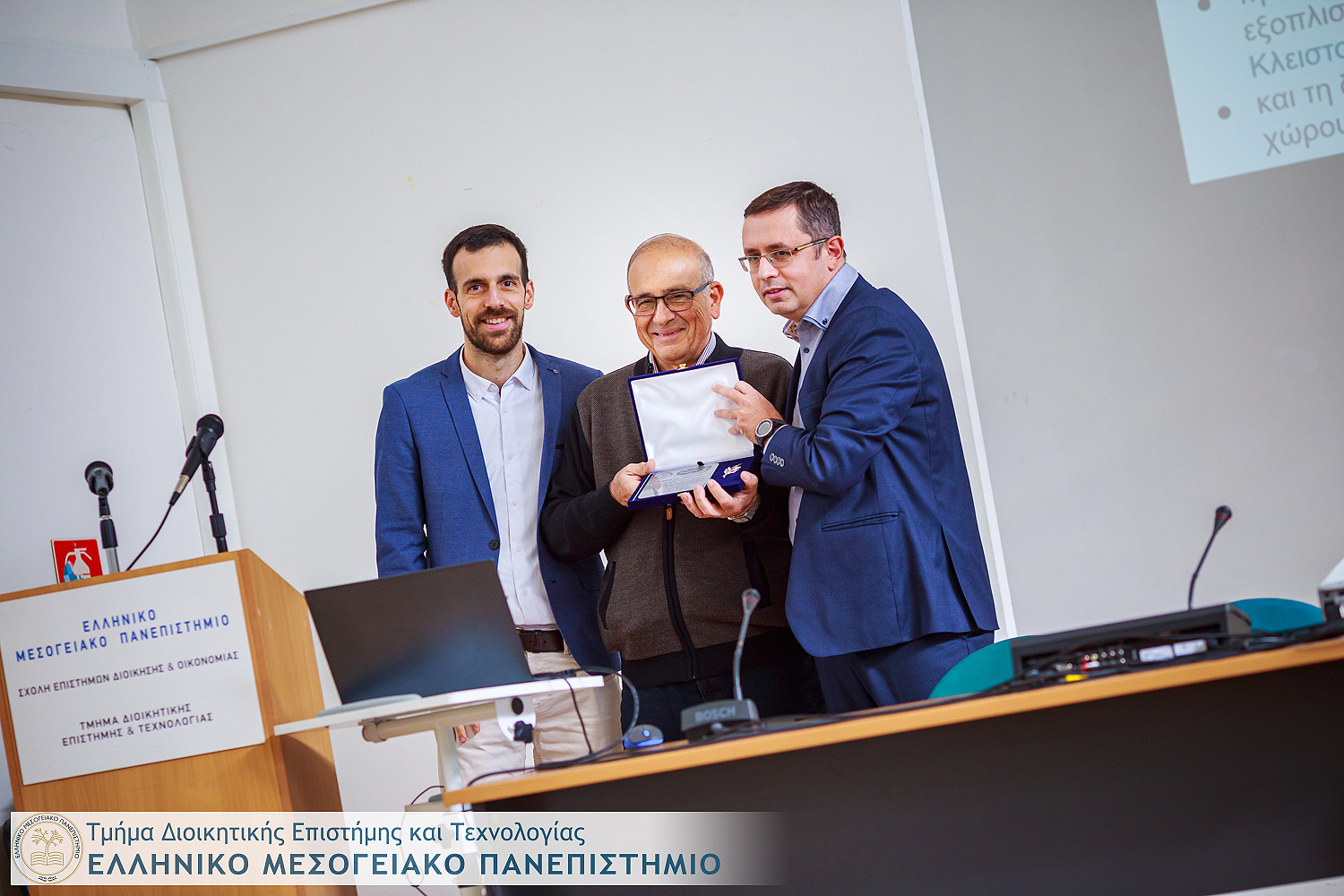 Μετά την ολοκλήρωση των παρουσιάσεων απονεμήθηκε στους ιδιοκτήτες του ξενοδοχείου ELOUNDA RESIDENCE RESORT & WATERPARK κκ. Ιωάννη και Παύλο Καρδουλάκη τιμητική πλακέτα από τον Πρόεδρο του Τμήματος για την ευγενική τους χορηγία προς το Τμήμα που περιλαμβάνει τη συντήρηση και αναβάθμιση του εξοπλισμού της αίθουσας οργάνων του Κλειστού Γυμναστηρίου και τη δωρεά επίπλων για τη δημιουργία χώρου εργασίας των φοιτητών.