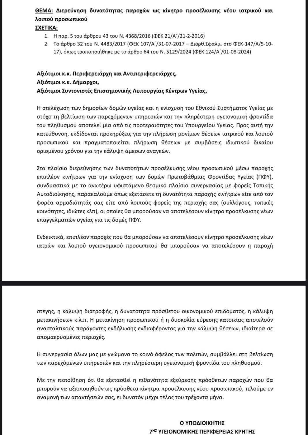 Προς τον Περιφερειάρχη Κρήτης, τους Αντιπεριφερειάρχες και τους Δημάρχους για την παροχή επιπλέον κινήτρων για την προσέλκυση νέου ιατρικού και λοιπού προσωπικού σε δημόσιες δομές υγείας της Κρήτης.