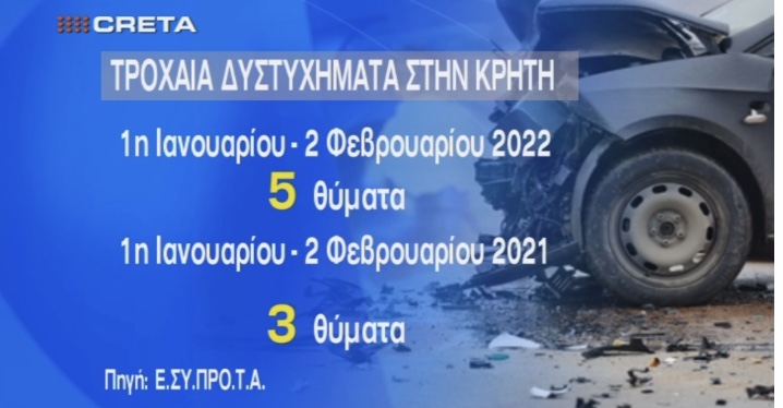 Σύμφωνα με το ρεπορτάζ της Τηλεόρασης CRETA και τα στοιχεία που παρουσιάστηκαν από τον Εθελοντικό Σύλλογο Πρόληψης Τροχαίων Ατυχημάτων από 1/1 έως και 2/2 έχουν χάσει τη ζωή τους στην άσφαλτο του νησιού πέντε άτομα ενώ το ίδιο διάστημα το 2021 τρεις άνθρωποι είχαν αφήσει την τελευταία τους πνοή στους δρόμους της Κρήτης.