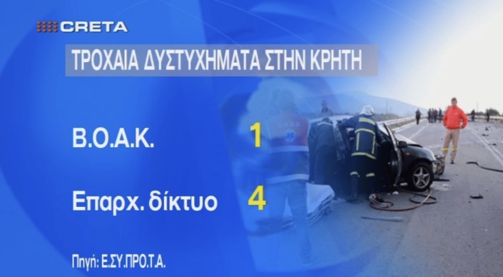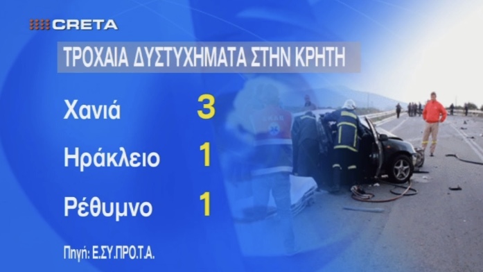 Σύμφωνα με τα στοιχεία του προέδρου Γιάννη Λιονάκη, ένας άνθρωπος έχασε τη ζωή του επί του Βόρειου Οδικού Άξονα Κρήτης ενώ τα υπόλοιπα τέσσερα δυστυχήματα σημειώθηκαν στο επαρχιακό δίκτυο του νησιού.