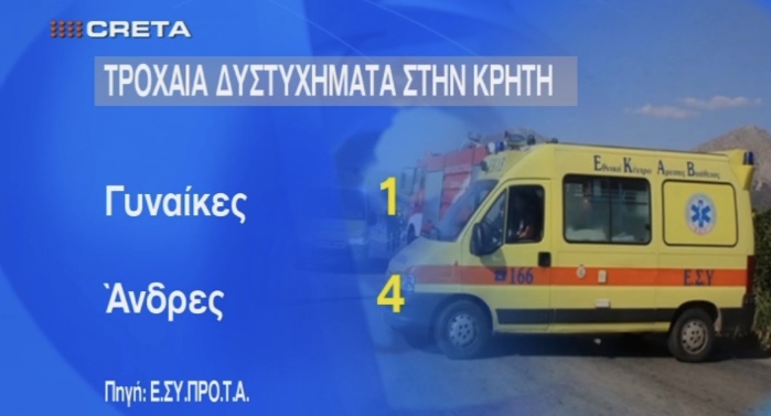 Τέσσερις άνδρες και μία γυναίκα, είναι τα θύματα της ασφάλτου στην Κρήτη ενώ η κύρια αιτία των τροχαίων, όπως προκύπτει από τα στατιστικά, είναι οι εκτροπές και οι συγκρούσεις των οχημάτων.