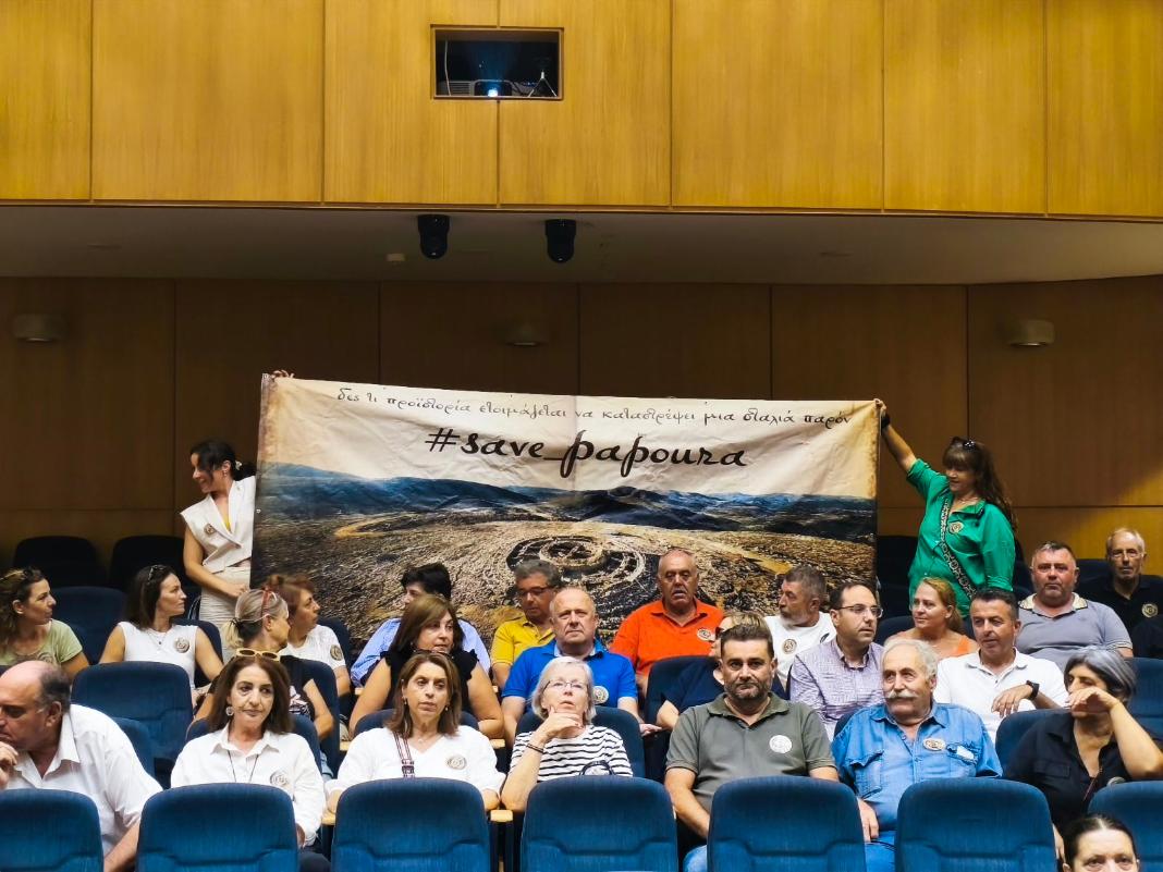 Με δυναμικό τρόπο και την ανάρτηση πανό με το σύνθημα «Save Papoura» μέλη της Επιτροπής Αγώνα, κάτοικοι, φορείς και εκπρόσωποι της Τοπικής Αυτοδιοίκησης, έκαναν για μια ακόμη φορά αισθητή την παρουσία τους, το πρωί της Πέμπτης, στο Επιμελητήριο Ηρακλείου, όπου διεξαγόταν η ημερίδα του Υπουργείου Πολιτισμού με θέμα «Καινοτομία και Παράδοση στη Σύγχρονη Χειροτεχνία».