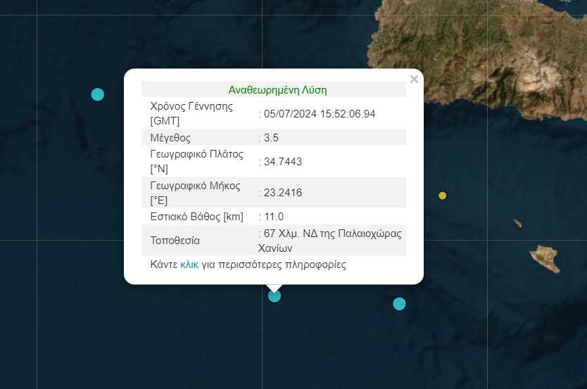 Το επίκεντρο της δόνησης εντοπίζεται 67 χιλιόμετρα νοτιοδυτικά της Παλαιοχώρας Χανίων και το εστιακό βάθος στα 11 χιλιόμετρα.