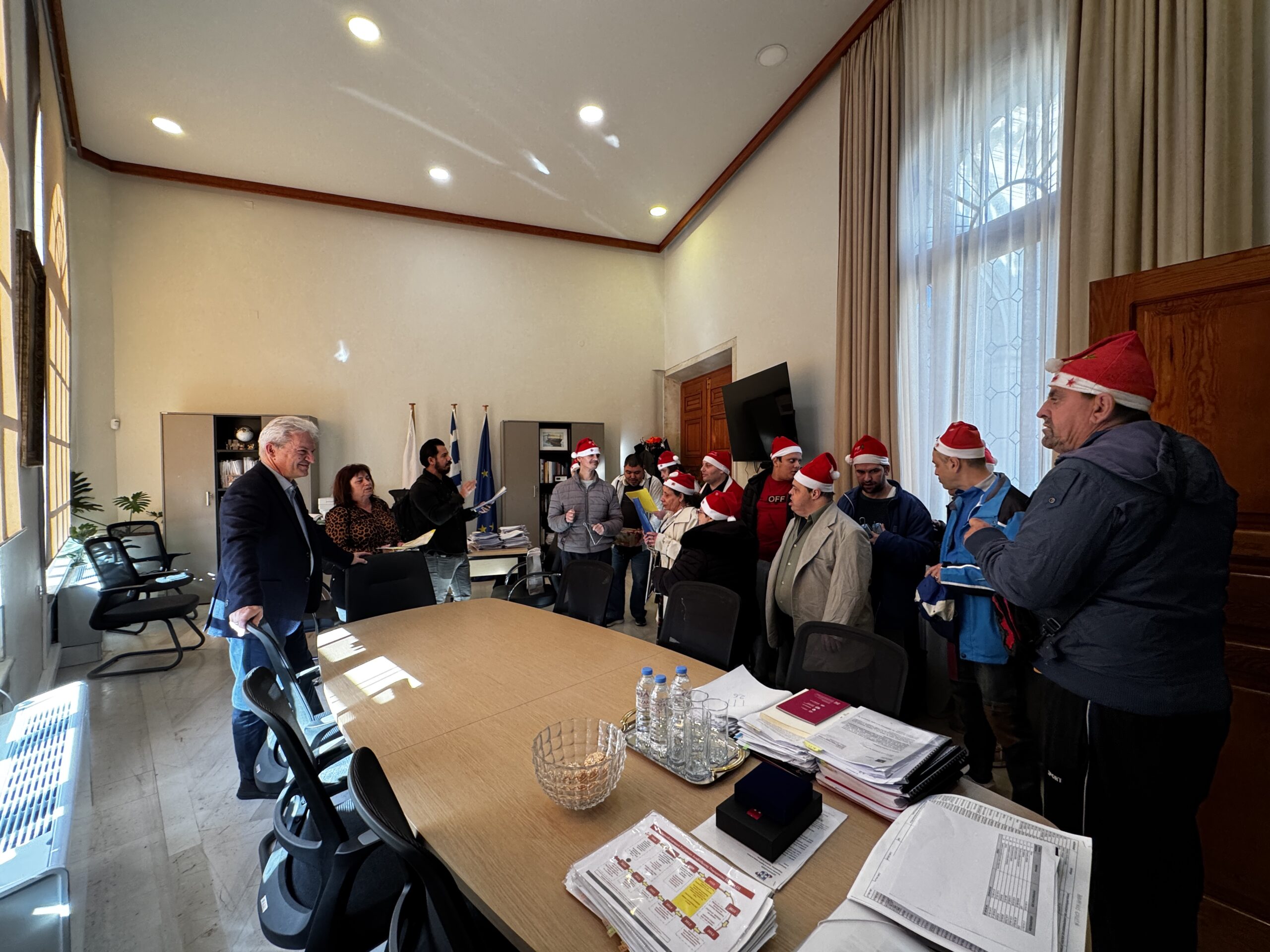 Tα Χριστουγεννιάτικα κάλαντα έψαλαν στον Δήμαρχο Ηρακλείου Αλέξη Καλοκαιρινό τα μέλη του Κέντρου Ειδικών Παιδιών «Άγιος Σπυρίδων» που τον επισκέφθηκαν στο γραφείο του στη Λότζια, το πρωί της Παρασκευής 19/12.