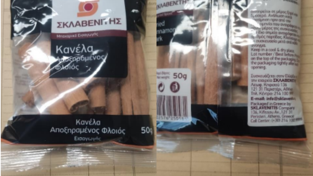 Συγκεκριμένα πρόκειται για το προϊόν με ονομασία πώλησης ‘Κανέλα-Αποξηραμένος φλοιός’ και εμπορική ονομασία “Σκλαβενίτης”, σε συσκευασία των 50,0g, με αριθμό παρτίδας Lot 2405300840 και ημερομηνία ανάλωσης κατά προτίμηση πριν από 28/05/2026.