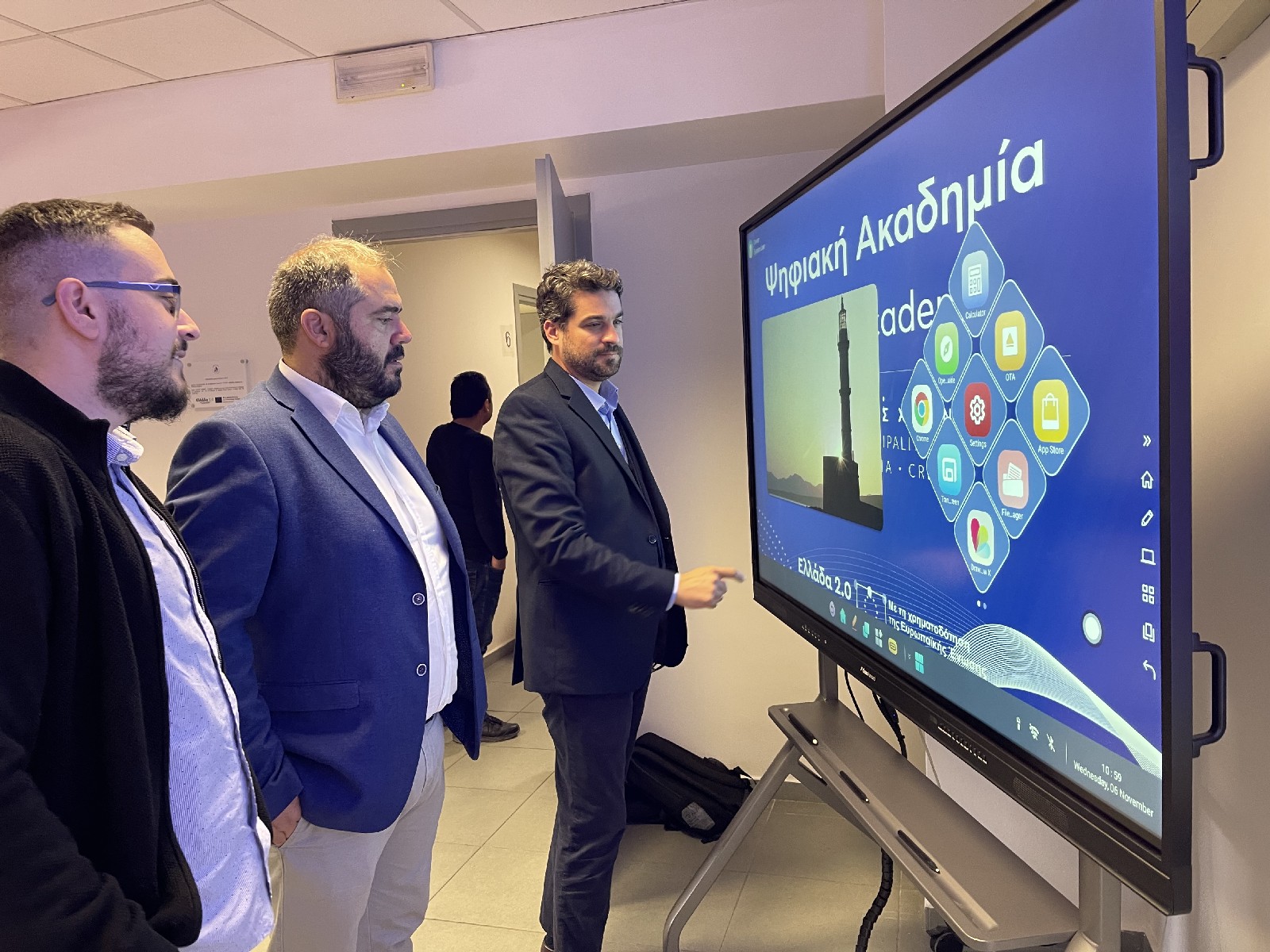 Στα εγκαίνια της νέας, πρότυπης Ψηφιακής Ακαδημίας του Δήμου Χανίων, παρευρέθηκε σήμερα ο Δήμαρχος Χανίων, Παναγιώτης Σημανδηράκης συνοδευόμενος από τον Γενικό Γραμματέα του Δήμου Χανίων, Γιώργο Φραγκιαδάκη, τον Αντιδήμαρχο Οικονομικών και Ψηφιακής Διακυβέρνησης, Τάσο Αλόγλου και τον δημοτικό σύμβουλο και εντεταλμένο του Δήμου Χανίων σε θέματα ανάπτυξης ψηφιακών εφαρμογών, Μανώλη Κελαϊδή.