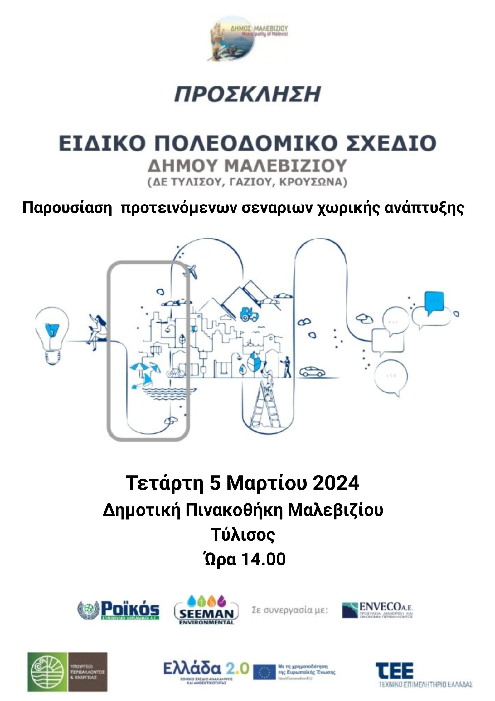 Τα αρχικά πορίσματα της μελέτης του Ειδικού Πολεοδομικού Σχεδίου του Δήμου Μαλεβιζίου καθώς και τα προτεινόμενα σενάρια χωρικής ανάπτυξης, θα παρουσιαστούν σε εκδήλωση ανοιχτή στο κοινό, την Τετάρτη 5 Μαρτίου στις 14.00 στη Δημοτική Πινακοθήκη στην Τύλισο.