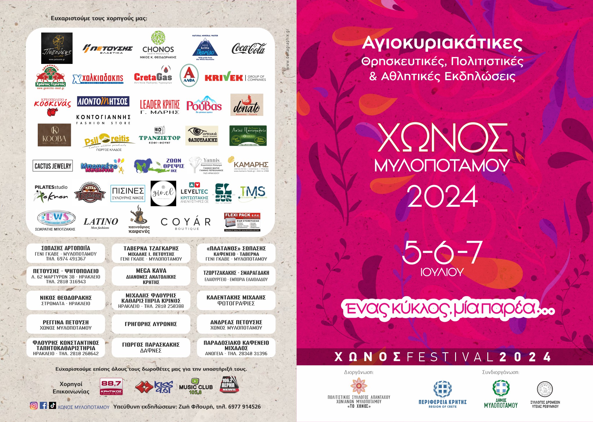 Συναυλίες, χοροί, εκθέσεις τέχνης, παιχνίδια για παιδιά και αθλητικές δραστηριότητες συνθέτουν το πρόγραμμα του «Χώνος Φέστιβαλ – Αγιοκυριακάτικες Εκδηλώσεις 2024» που με αφορμή τον εορτασμό της Αγίας Κυριακής και για τρείς ημέρες, καθιστούν τον ορεινό όγκο του Μυλοποτάμου σε κέντρο πολιτισμού και γνήσιας κρητικής ψυχαγωγίας και φιλοξενίας.