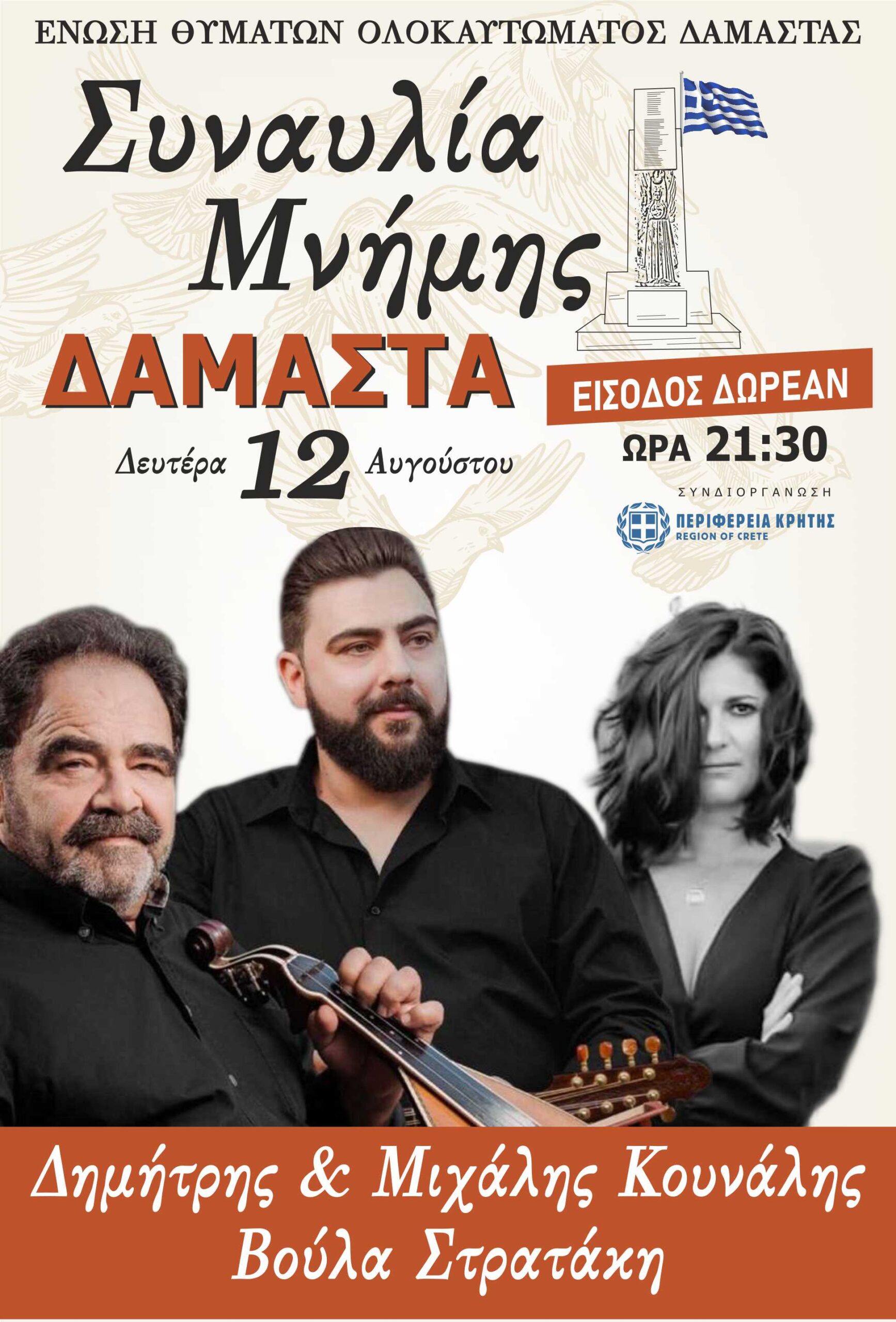 Την Δευτέρα 12-8-2024 και ώρα 21.30 η Ένωση Θυμάτων Ολοκαυτώματος Δαμάστας σε συνδιοργάνωση με την Περιφέρεια Κρήτης διοργανώνει συναυλία στον προαύλιο χώρο του Δημοτικού Σχολείου Δαμάστας με το συγκρότημα των Δημήτρη και Μιχάλη Κουνάλη και την Βούλα Στρατάκη. Η είσοδος θα είναι ελεύθερη.