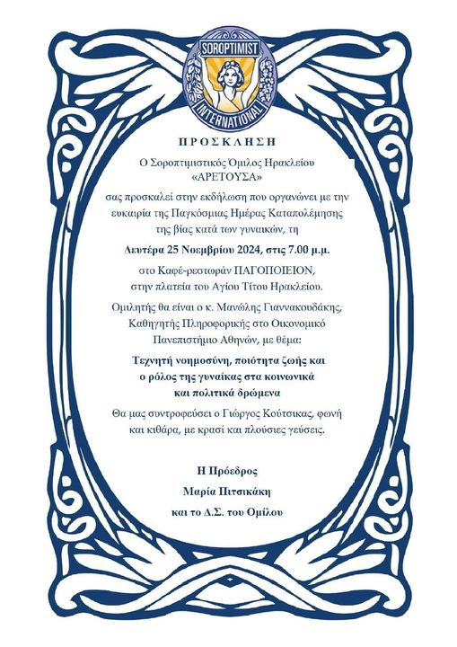 Με ευκαιρία την Παγκόσμια Ημέρα Καταπολέμησης της Βίας κατά των Γυναικών, ο Σοροπτιμιστικός Όμιλος Ηρακλείου ΑΡΕΤΟΥΣΑ διοργανώνει εκδήλωση τη Δευτέρα 25 Νοεμβρίου 2024 στις 7 μμ στο Καφέ- ρέσταραν (πλατεία Αγ. Τίτου Ηράκλειο).