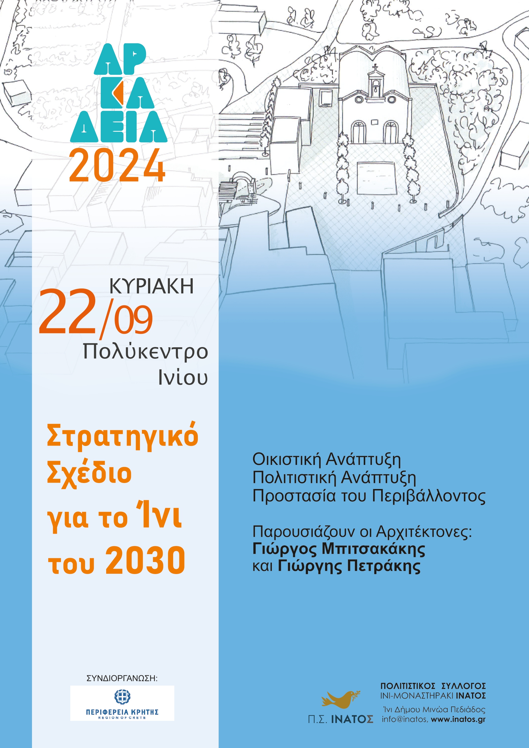 Στο πλαίσιο των εκδηλώσεων «ΑΡΚΑΔΕΙΑ 2024», την Κυριακή 22 Σεπτεμβρίου 2024, στις 11:00 π.μ., στο Πολιτιστικό Πολύκεντρο Ινίου του Δήμου Μινώα Πεδιάδας, θα πραγματοποιηθεί η παρουσίαση του «Στρατηγικού Σχεδίου για το Ίνι του 2030». Η εκδήλωση του Πολιτιστικού Συλλόγου Ίνι – Μοναστηράκι, που πραγματοποιείται σε συνδιοργάνωση με την Περιφέρεια Κρήτης, θα επικεντρωθεί στην οικιστική, πολιτιστική ανάπτυξη και την προστασία του περιβάλλοντος με στόχο την ανάδειξη και βιώσιμη ανασυγκρότηση του ιστορικού οικισμού.