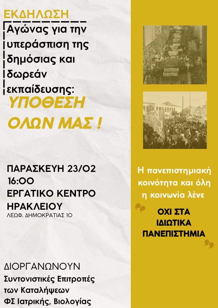 “Οι Συντονιστικές Επιτροπές Καταλήψεων των ΦΣ Ιατρικής και Βιολογικού σας προσκαλούν την Παρασκευή 23/2 στις 16:00 στο Εργατικό Κέντρο Ηρακλείου στην εκδήλωση «Αγώνας για την υπεράσπιση της δημόσιας και δωρεάν εκπαίδευσης: ΥΠΟΘΕΣΗ ΟΛΩΝ ΜΑΣ». Θα μιλήσουν μέλη της πανεπιστημιακής κοινότητας.