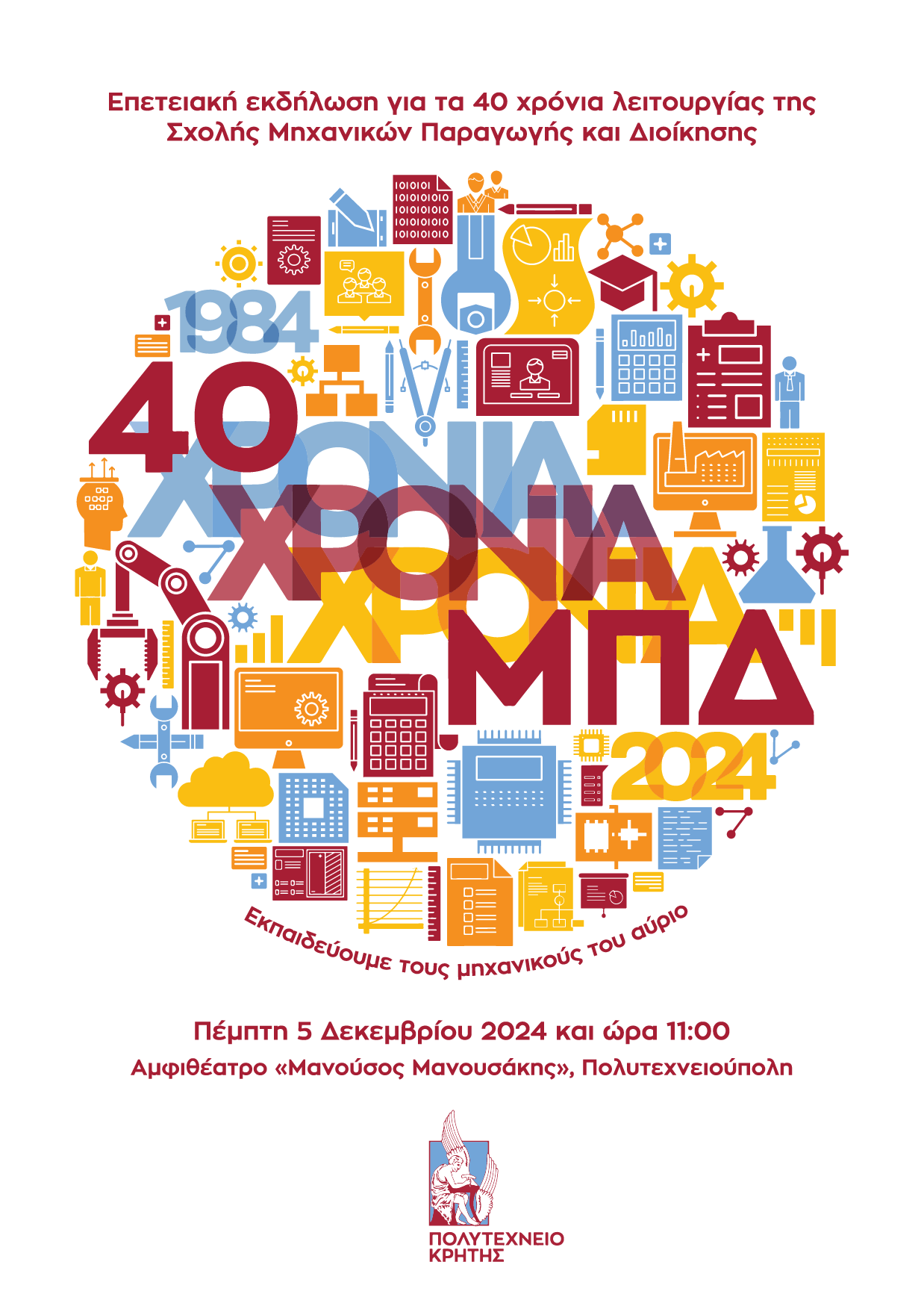 Η Σχολή Μηχανικών Παραγωγής και Διοίκησης (ΜΠΔ) του Πολυτεχνείου Κρήτης συμπληρώνει 40 χρόνια λειτουργίας. Η Σχολή ιδρύθηκε ως Τμήμα το 1983 και δέχθηκε για πρώτη φορά φοιτητές το 1984, ενώ από το 2013 λειτουργεί με την παρούσα οργανωτική της δομή ως μονοτμηματική Σχολή.