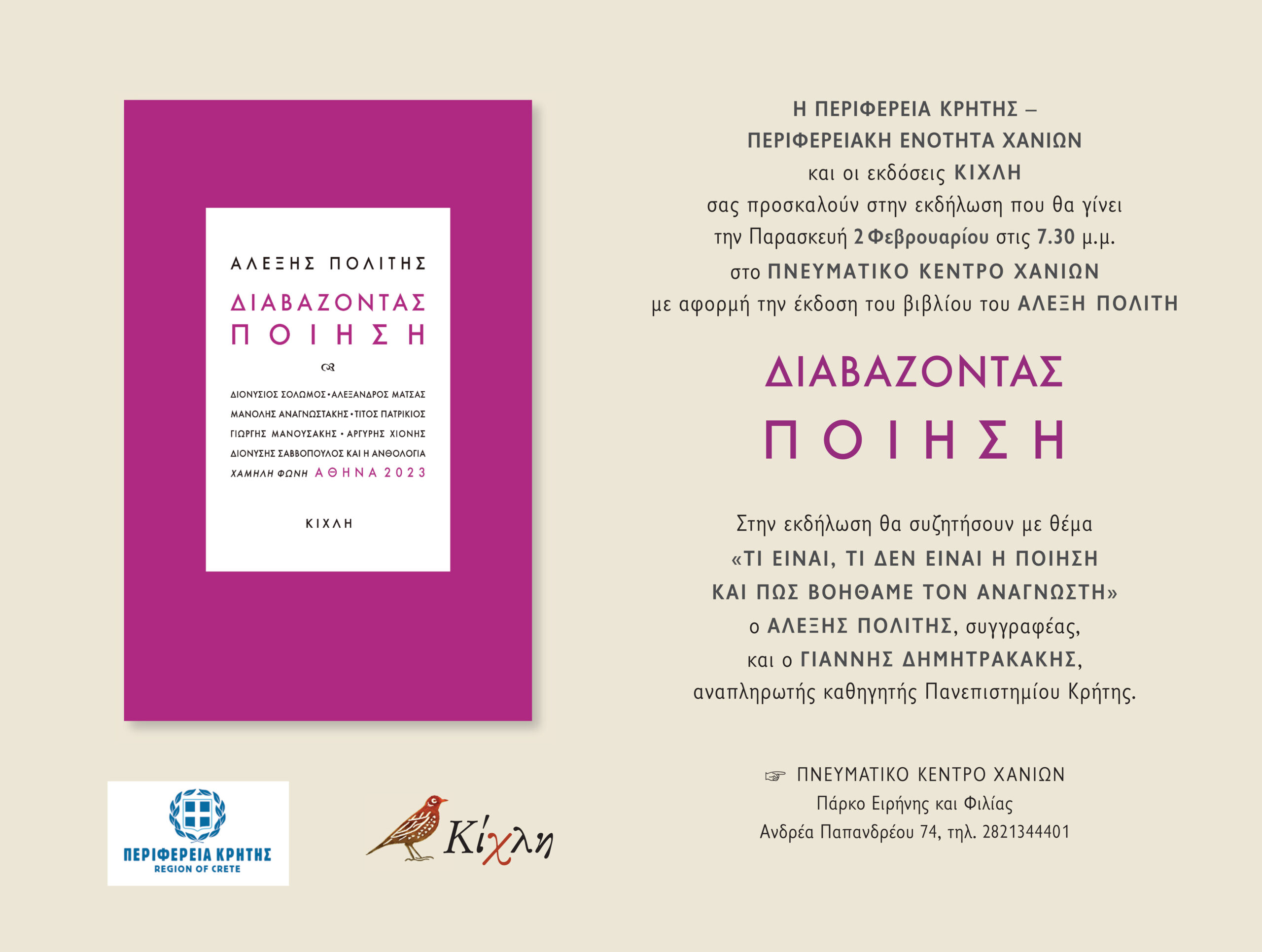 «Τι είναι, τι δεν είναι η Ποίηση και πώς βοηθάμε τον Αναγνώστη», είναι το θέμα συζήτησης που θα αναπτύξουν ο συγγραφέας Αλέξης Πολίτης και ο αν. καθηγητής Πανεπιστημίου Κρήτη, Γιάννης Δημητρακάκης, με αφορμή την έκδοση του βιβλίου του πρώτου, «Διαβάζοντας Ποίηση».