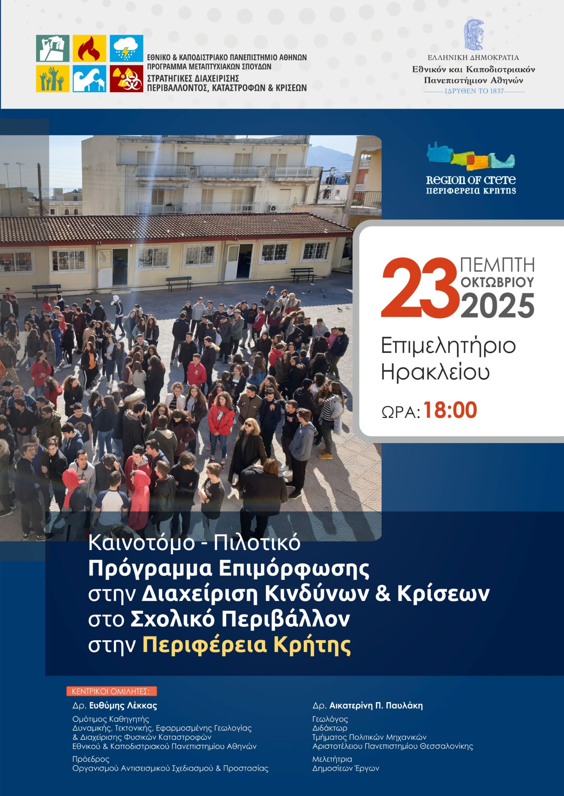 Η Περιφέρεια Κρήτης διοργανώνει την Πέμπτη, 23 Οκτωβρίου 2025, ώρα 18:00, στην Αίθουσα Καστελλάκη του Επιμελητηρίου Ηρακλείου ενημερωτική εκδήλωση για την ολοκλήρωση και την παρουσίαση των αποτελεσμάτων του «Καινοτόμου – Πιλοτικού Προγράμματος Επιμόρφωσης στη Διαχείριση Κινδύνων & Κρίσεων στο Σχολικό Περιβάλλον στην Περιφέρεια Κρήτης».