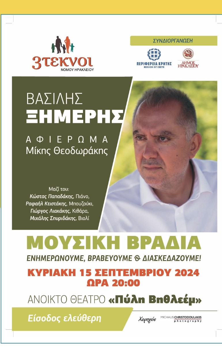 Ο Σύλλογος Τριτέκνων Νομού Ηρακλείου καλεί τα μέλη του στην ετήσια εκδήλωση, που θα πραγματοποιηθεί την Κυριακή 15 Σεπτεμβρίου, στις 8:00 μμ., στο ανοικτό Θέατρο «ΠΥΛΗ ΒΗΘΛΕΕΜ», με συνδιοργανωτές την Περιφέρεια Κρήτης και τον Δήμο Ηρακλείου και με ελεύθερη είσοδο.