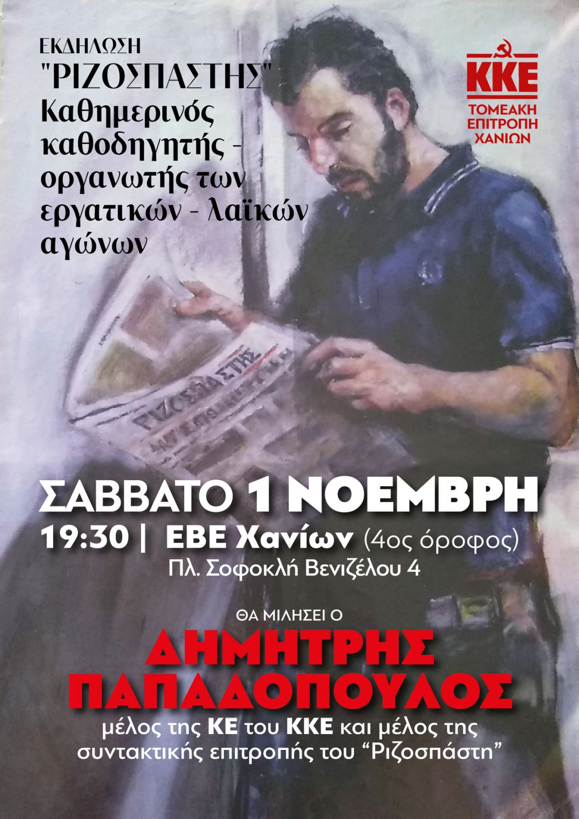 Η Τομεακή Επιτροπή Χανίων του ΚΚΕ διοργανώνει εκδήλωση το Σάββατο 1 Νοεμβρίου, στις 7.30μ.μ. στο Εμποροβιομηχανικό Επιμελητήριο Χανίων (ΕΒΕΧ) στον 4ο όροφο (πλ. Σοφ. Βενιζέλου 4), με θέμα: