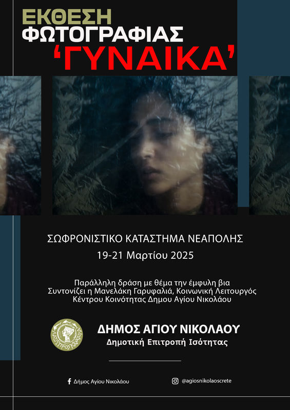Έκθεση φωτογραφίας με θέμα «Γυναίκα» διοργανώνει ο Δήμος Αγίου Νικολάου σε συνεργασία με την Δημοτική Επιτροπή Ισότητας στις εγκαταστάσεις του Σωφρονιστικού Καταστήματος Κράτησης Νεάπολης.