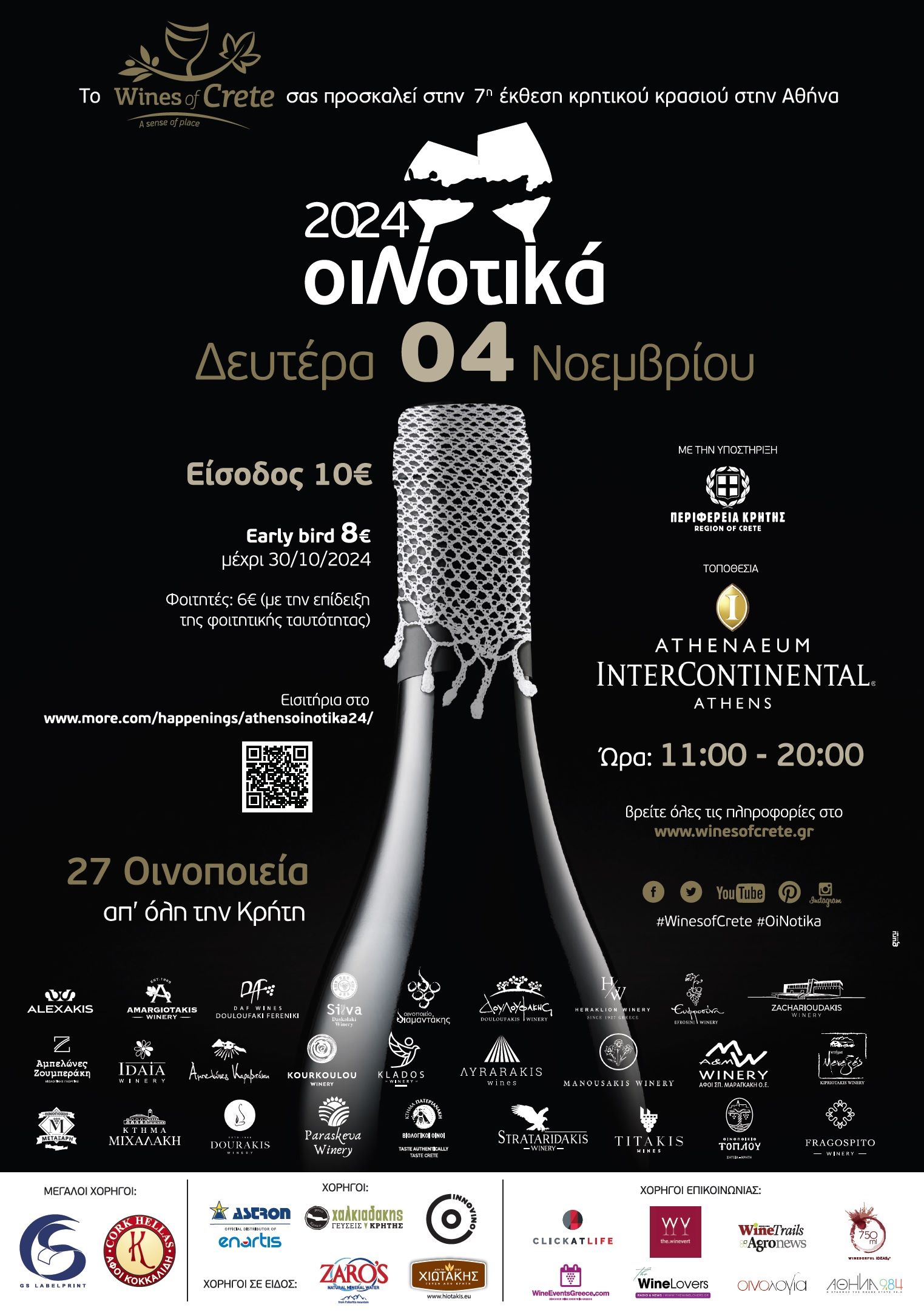 Η οινική Κρήτη με την υποστήριξη της Περιφέρειας Κρήτης, ταξιδεύει και φέτος στην Αθήνα με 11 γηγενείς ποικιλίες, 7 ζώνες ΠΟΠ, 6 ζώνες ΠΓΕ και 28 Οινοποιεία, καλωσορίζοντας τους επαγγελματίες και το οινόφιλο κοινό για γευστικές δοκιμές και οινικές συζητήσεις.