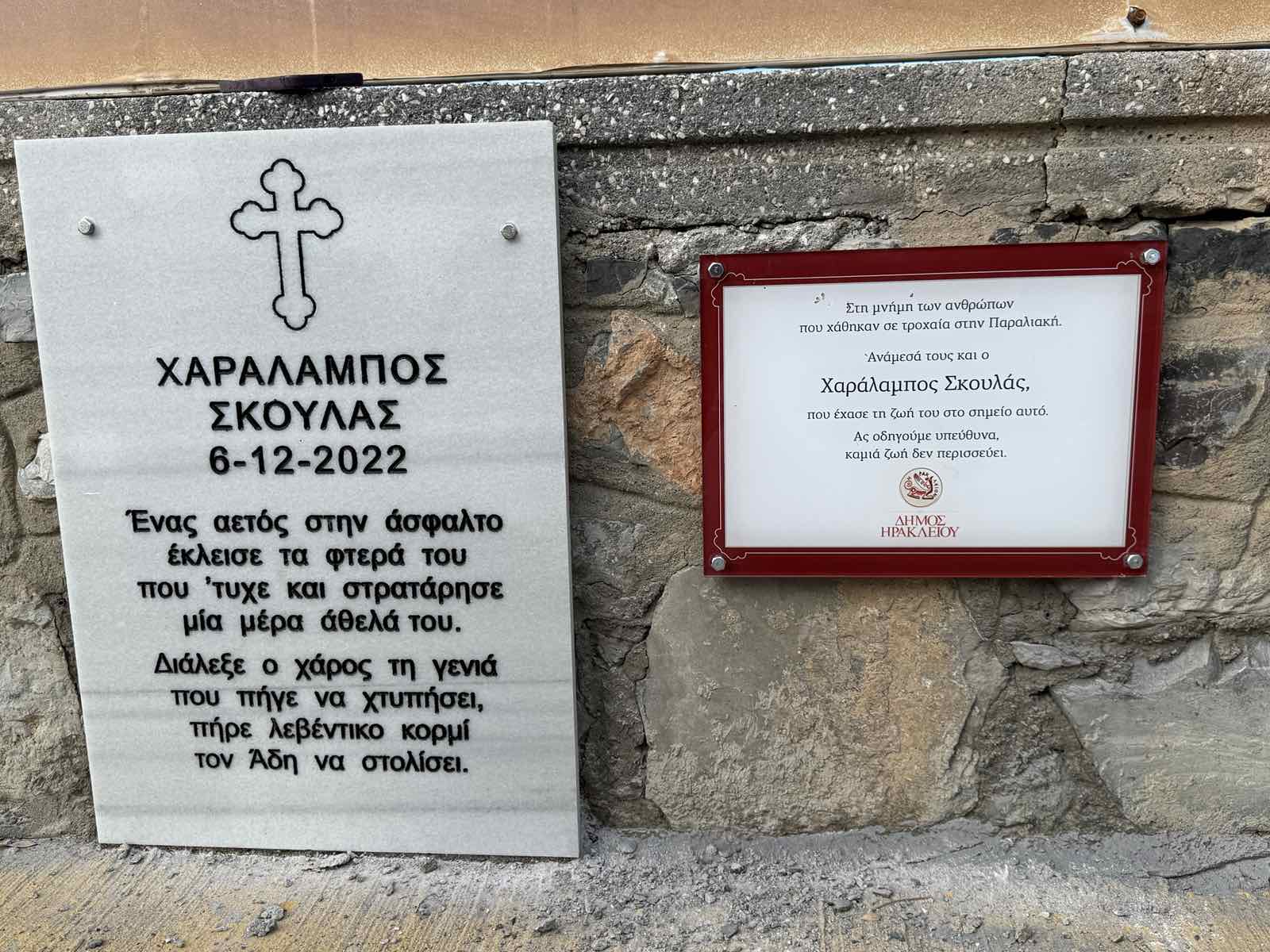Η τιμητική πλακέτα που τοποθετήθηκε στην παραλιακή λεωφόρο στέκεται πλέον ως μνήμη της προσφοράς του Χαράλαμπου Σκουλά, αλλά και ως σύμβολο για όλα τα θύματα των τροχαίων.