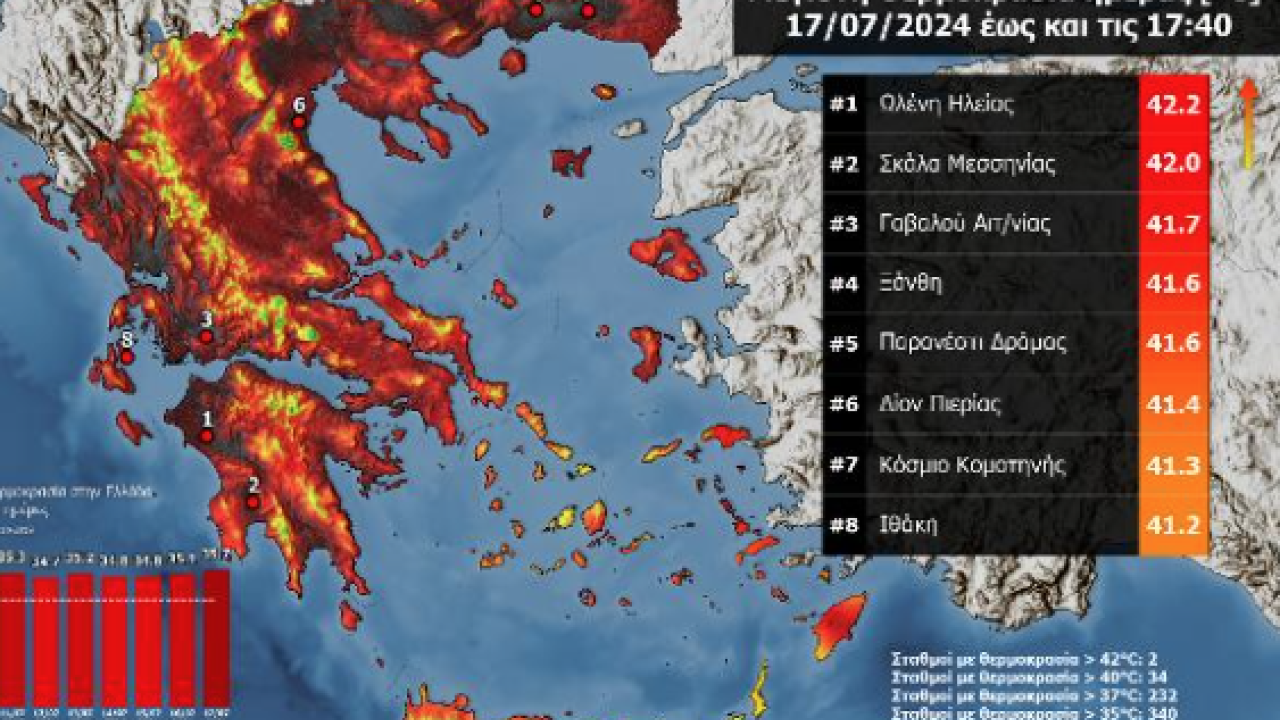 Συνεχίζονται για δέκατη συνεχόμενη ημέρα οι πολύ υψηλές θερμοκρασίες στη χώρα μας. Η μέγιστη θερμοκρασία την Τετάρτη 17/07 καταγράφηκε στην Ωλένη Ηλείας (42.2 °C) και ακολούθησε η Σκάλα Μεσσηνίας (42.0 °C) και η Γαβαλού Αιτωλοακαρνανίας (41.7 °C). Στον χάρτη της εικόνας παρουσιάζεται η κατανομή της μέγιστης θερμοκρασίας στη χώρα σύμφωνα με δίκτυο αυτόματων μετεωρολογικών σταθμών του Εθνικού Αστεροσκοπείου Αθηνών.