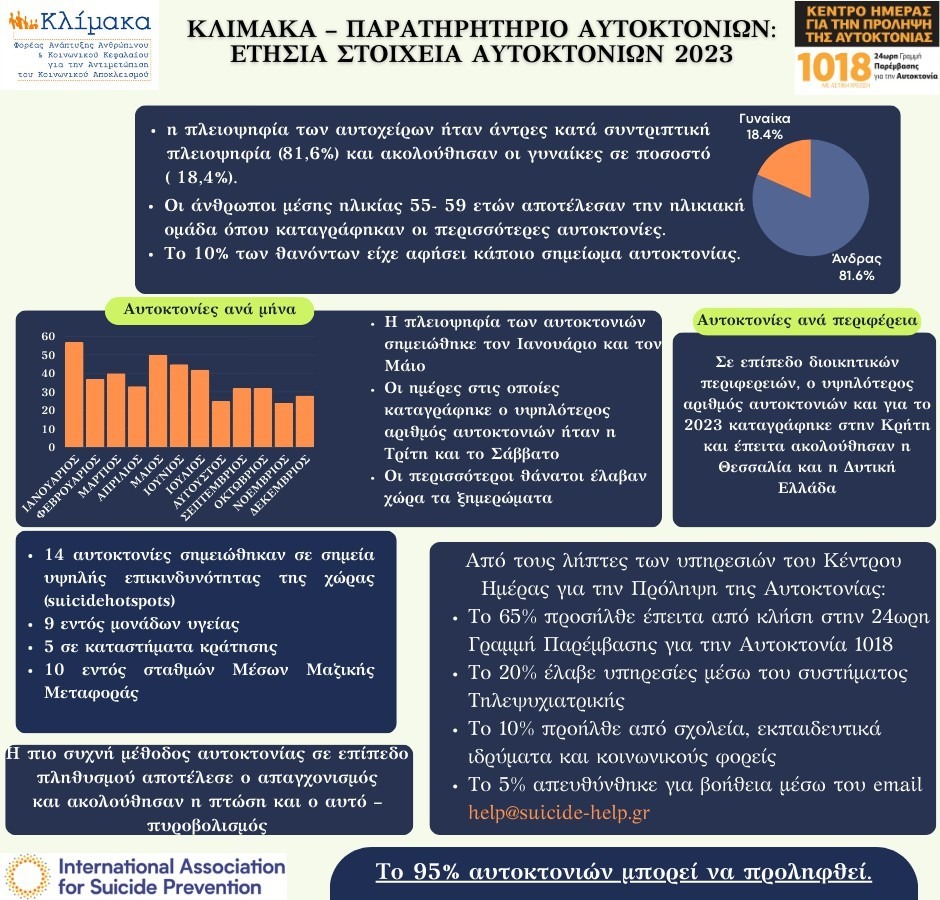 Τα στοιχεία για το 2023, όπως καταγράφηκαν και συλλέχθηκαν από το δίκτυο καταγραφής της ΚΛΙΜΑΚΑ, παρουσιάζουν μείωση του αριθμού των αυτοκτονιών σε σύγκριση με τα στοιχεία του Παρατηρητηρίου για το έτος 2022.
