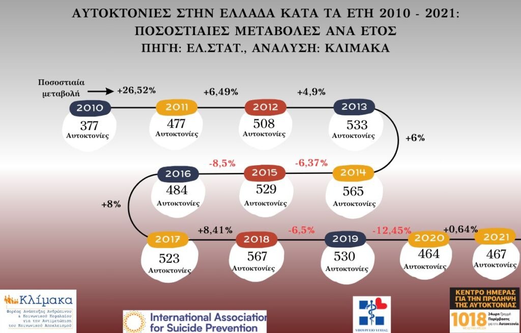 Τα στοιχεία της ΕΛΣΤΑΤ για το 2021, τα οποία παρουσιάζει το Παρατηρητήριο Αυτοκτονιών «Κλίμακα» υποδεικνύουν, σε γενικές γραμμές, μία σταθεροποίηση των θανάτων σε σύγκριση με το 2020. Αναλυτικότερα, ο αριθμός των επίσημα καταγεγραμμένων αυτοκτονιών για το 2021 ανήλθε στους 467 θανάτους έναντι του 2020 που είχαν καταγραφεί 464. Την δεκαετία 2011 – 2021 σημειώθηκαν τουλάχιστον 5.500 αυτοκτονίες στην χώρα μας. Η πλειοψηφία των θανόντων για το έτος 2021, όπως και για τα προηγούμενα έτη, ήταν άνδρες σε ποσοστό 83%.