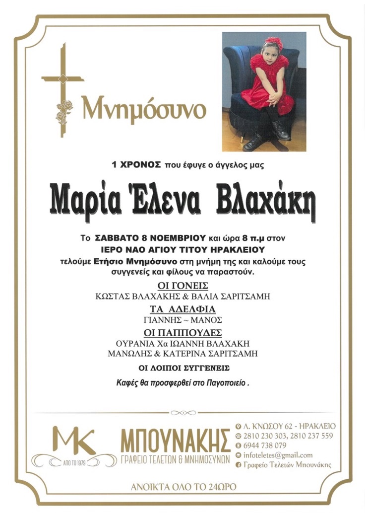 Συγγενείς και φίλοι θα τιμήσουν το Σάββατο τη μνήμη της Μαρίας – Έλενας. Το ετήσιο μνημόσυνο θα γίνει στον Ιερό Ναό του Αγίου Τίτου, στις 8 το πρωί.