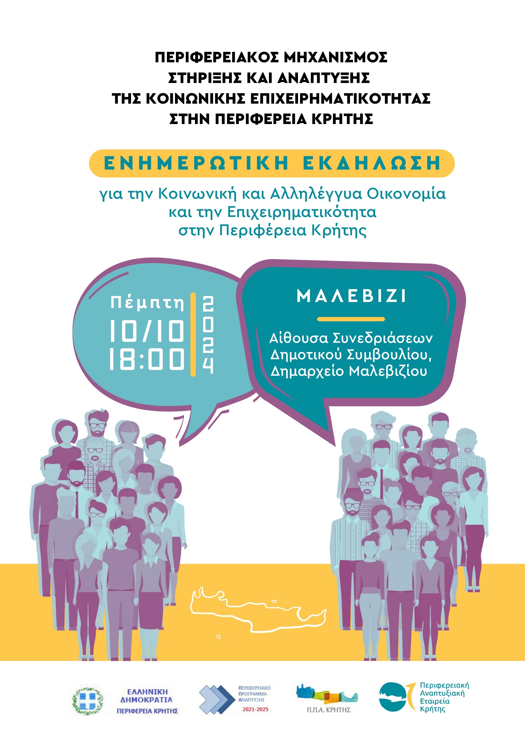 Η εκδήλωση οργανώνεται από την Περιφέρεια Κρήτης και την Περιφερειακή Αναπτυξιακή Εταιρεία Κρήτης ΑΕ σε συνεργασία με το Δήμο Μαλεβιζίου στα πλαίσια του έργου με τίτλο «Λειτουργία Περιφερειακού Μηχανισμού Στήριξης και Ανάπτυξης της Κοινωνικής Επιχειρηματικότητας στην Περιφέρεια Κρήτη» Άξονας Προτεραιότητας 1.3 «Προώθηση αποτελεσμάτων έρευνας, καινοτομίας και τεχνολογίας στις επιχειρήσεις » , Κωδικός ΟΠΣ 5214799 του ΠΠΑ ΠΕΡΙΦΕΡΕΙΑΣ ΚΡΗΤΗΣ 2021-2025,