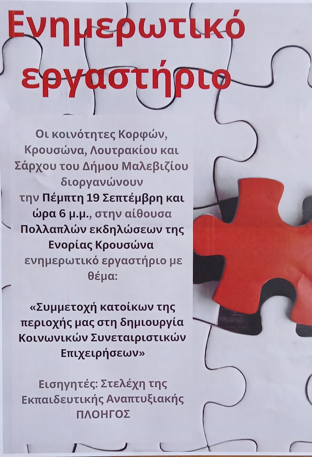 Οι τοπικές κοινότητες Κορφών, Κρουσώνα, Λουτρακίου και Σάρχου, του Δήμου Μαλεβιζίου, στοχεύοντας στην βιώσιμη ανάπτυξη της περιοχής τους και στην βελτίωση των κοινωνικών και οικονομικών συνθηκών, οργανώνουν σε συνεργασία με την εκπαιδευτική αναπτυξιακή «Πλοηγός» και με την υποστήριξη του Δήμου Μαλεβιζίου, ενημερωτικό εργαστήριο με θέμα: «Συμμετοχή των κατοίκων μας στην δημιουργία κοινωνικών συνεταιριστικών επιχειρήσεων»