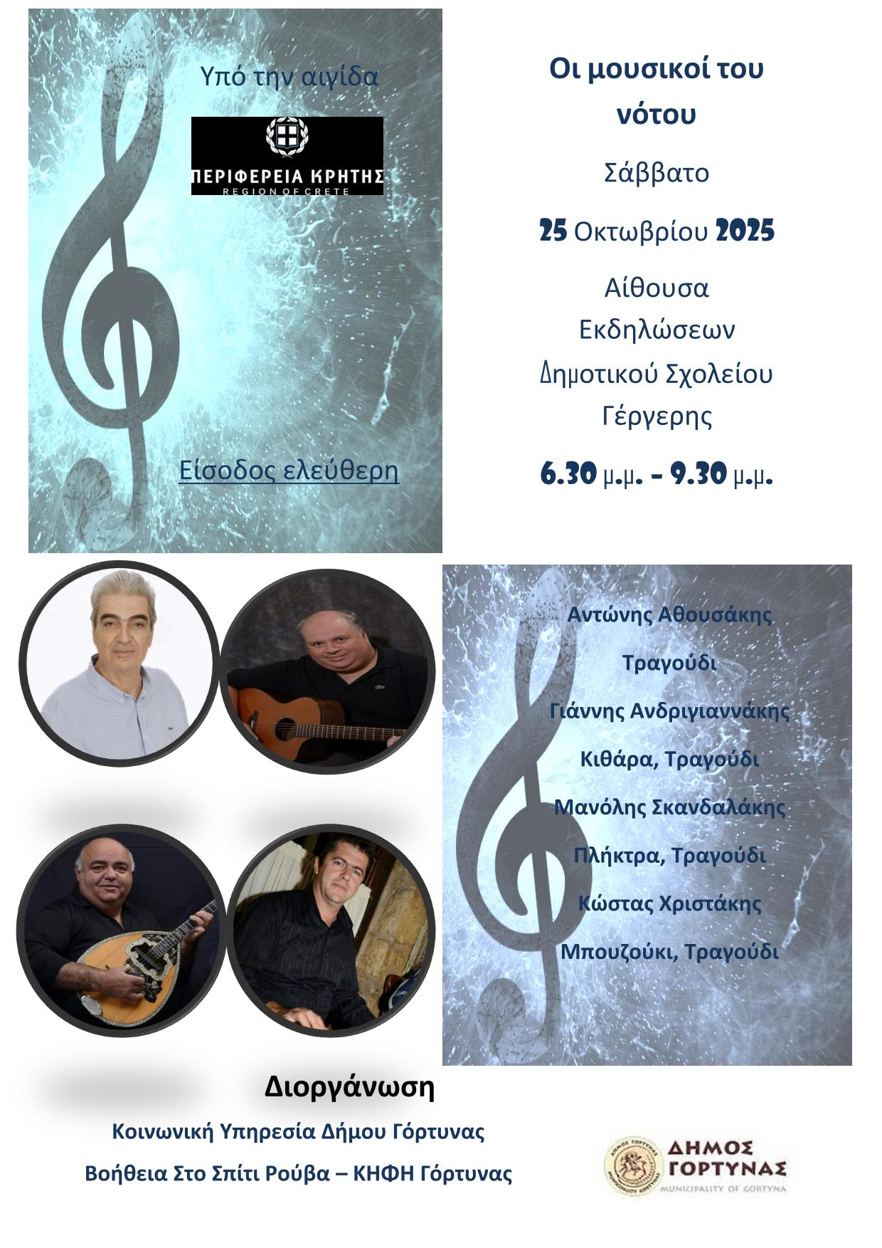 Θα ακολουθήσει τρίωρη μουσική εκδήλωση από τους «Μουσικούς του Νότου»: