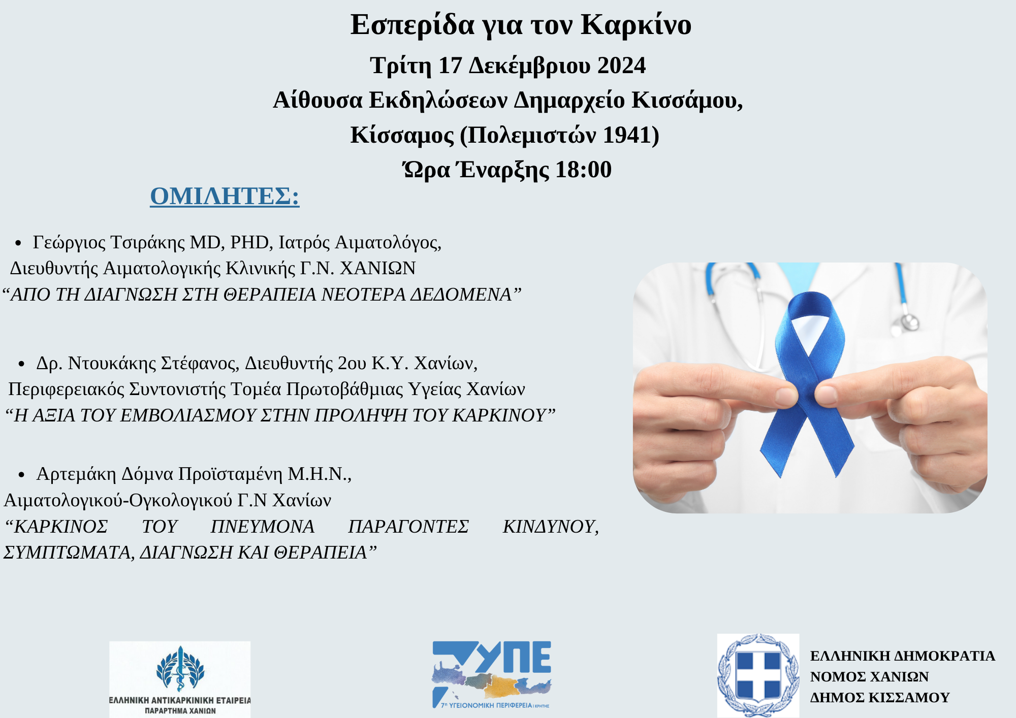 Την Τρίτη 17 Δεκεμβρίου 2024 και ώρα 18:00 το απόγευμα, στην αίθουσα εκδηλώσεων του Δημαρχείου Κισσάμου στα Χανιά, θα πραγματοποιηθεί ανοιχτή για το κοινό, επιστημονική ενημερωτική εκδήλωση για τον καρκίνο.