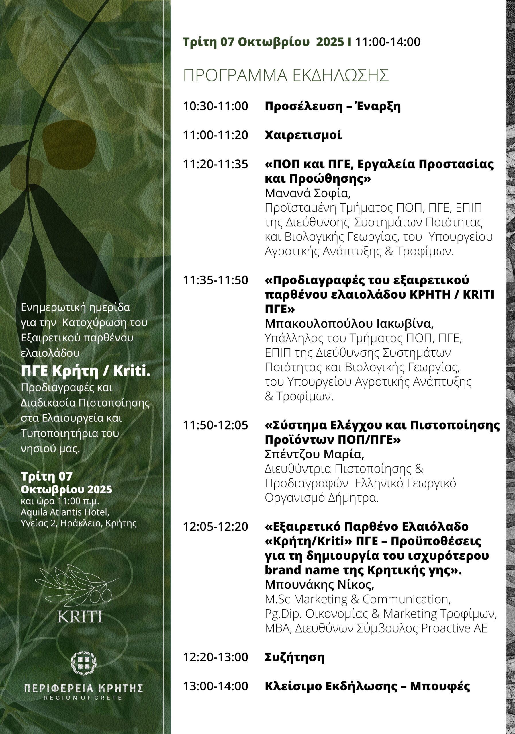 Ο Περιφερειάρχης Κρήτης, Σταύρος Αρναουτάκης, προσκαλεί όλους τους ελαιοπαραγωγούς, τους ιδιοκτήτες και εκπροσώπους ελαιουργείων και τυποποιητικών μονάδων, καθώς και κάθε εμπλεκόμενο στην αλυσίδα παραγωγής και εμπορίας του ελαιολάδου, να συμμετάσχουν στην εκδήλωση. Σκοπός της ημερίδας είναι η αναλυτική παρουσίαση του πλαισίου που διέπει το ΠΓΕ, των προδιαγραφών παραγωγής και των διαδικασιών που απαιτούνται για την πιστοποίηση του προϊόντος.