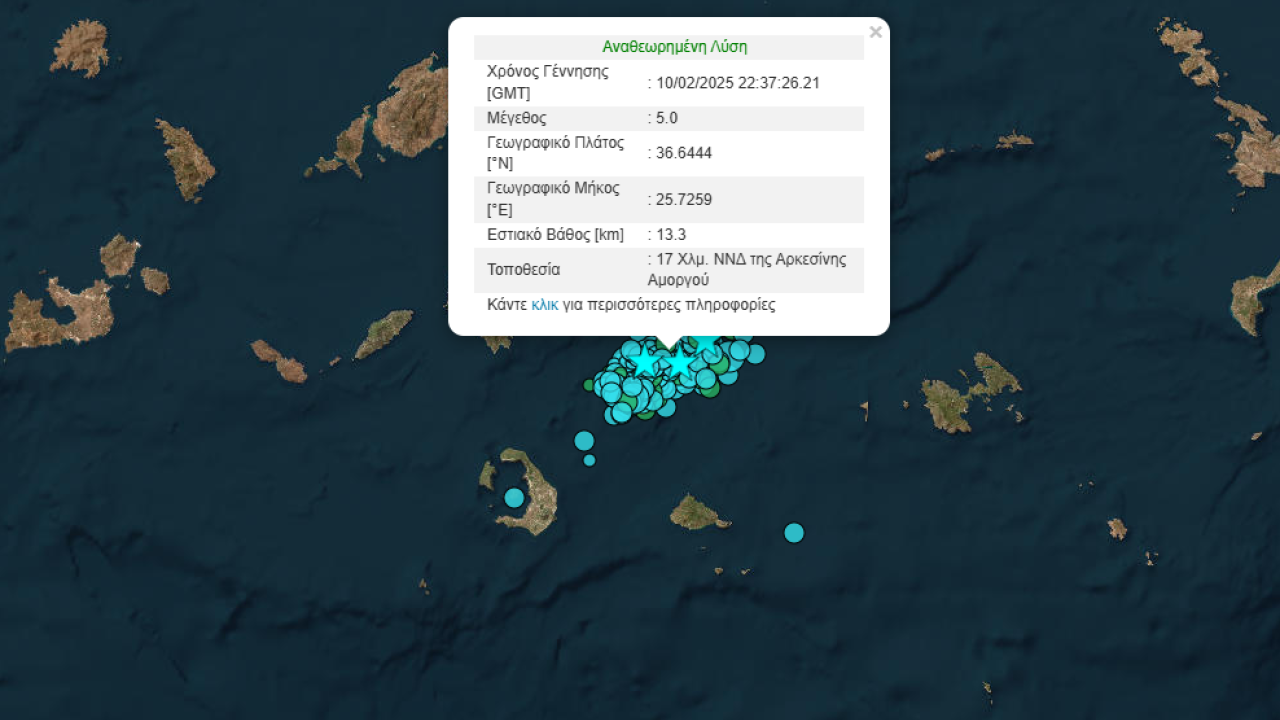 Το σεισμολογικό δίκτυο του Γεωδυναμικού Ινστιτούτου του Εθνικού Αστεροσκοπείου Αθηνών κατέγραψε σεισμό μεγέθους 5,0 βαθμών της κλίμακας Ρίχτερ, 18 χλμ. Νότια της Αρκεσίνης Αμοργού, ο οποίος έγινε ιδιαίτερα αισθητός και στην Αθήνα.