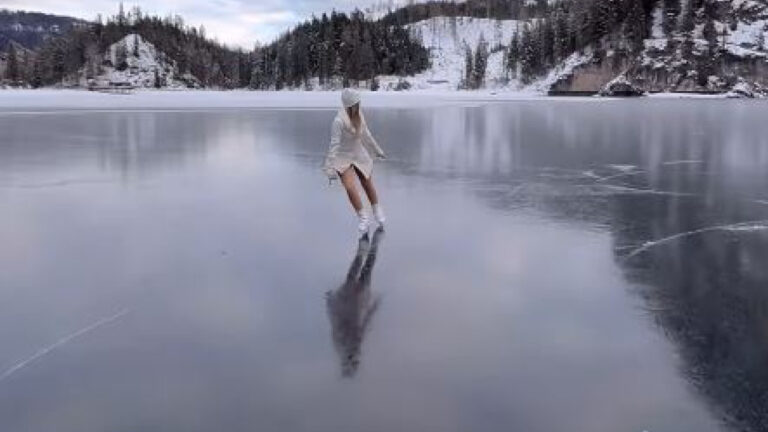 Σε εντυπωσιακό βίντεο, η Ντεντέλα κινείται με χάρη πάνω στην παγωμένη επιφάνεια της επιβλητικής λίμνης, προσφέροντας ένα απολαυστικό θέαμα.