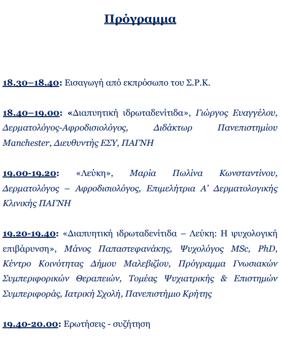 Η πρώτη προγραμματισμένη μας δράση στο νέο πεδίο των δερματικών νοσημάτων, πρόκειται να πραγματοποιηθεί στις 4/9/2024 και ώρα 18:30 στο ξενοδοχείο Astoria-Capsis στο Ηράκλειο με τίτλo «Διαπυητική ιδρωταδενίτιδα – Λεύκη: νέες θεραπευτικές επιλογές».