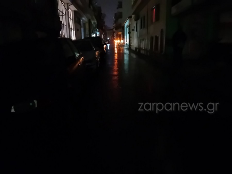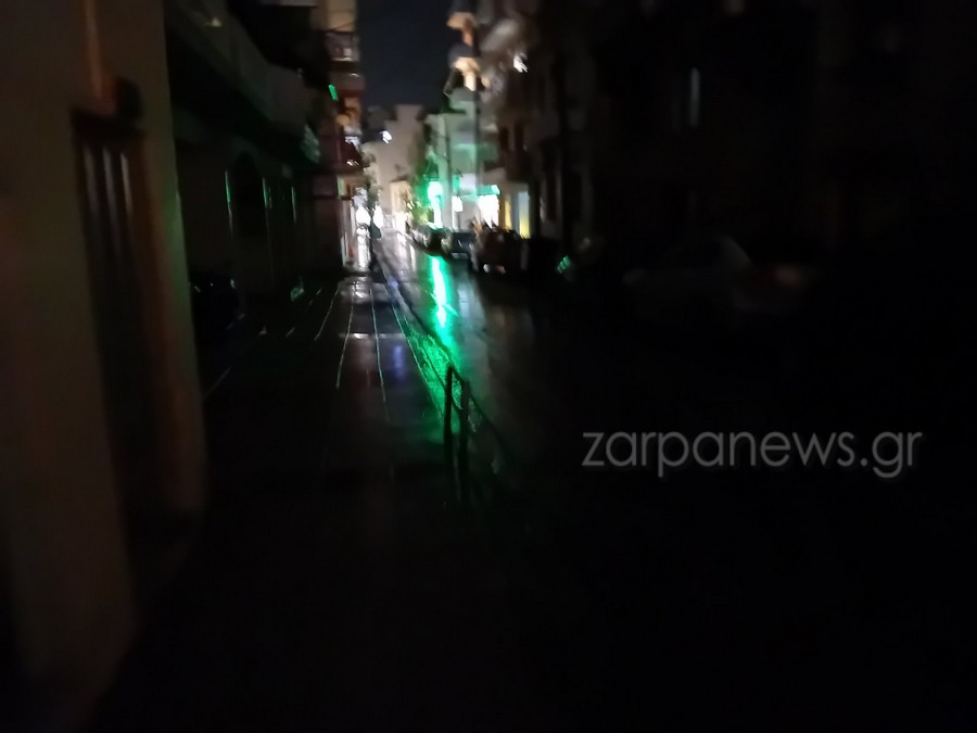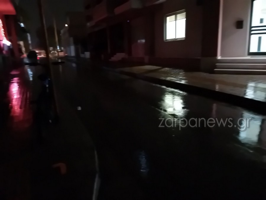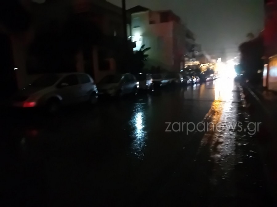 Η οδός Σφακίων, Σολωμού Κορνάρου και Μπονιαλή και Βακαωρίτου στο κέντρο της πόλης είναι εντελώς σκοτεινές και φωτίζονται μόνο από τα διερχόμενα αυτοκίνητα και καταστήματα, καθώς δεν λειτουργούν οι κολώνες ηλεκτροδότησης λόγω της βροχής.