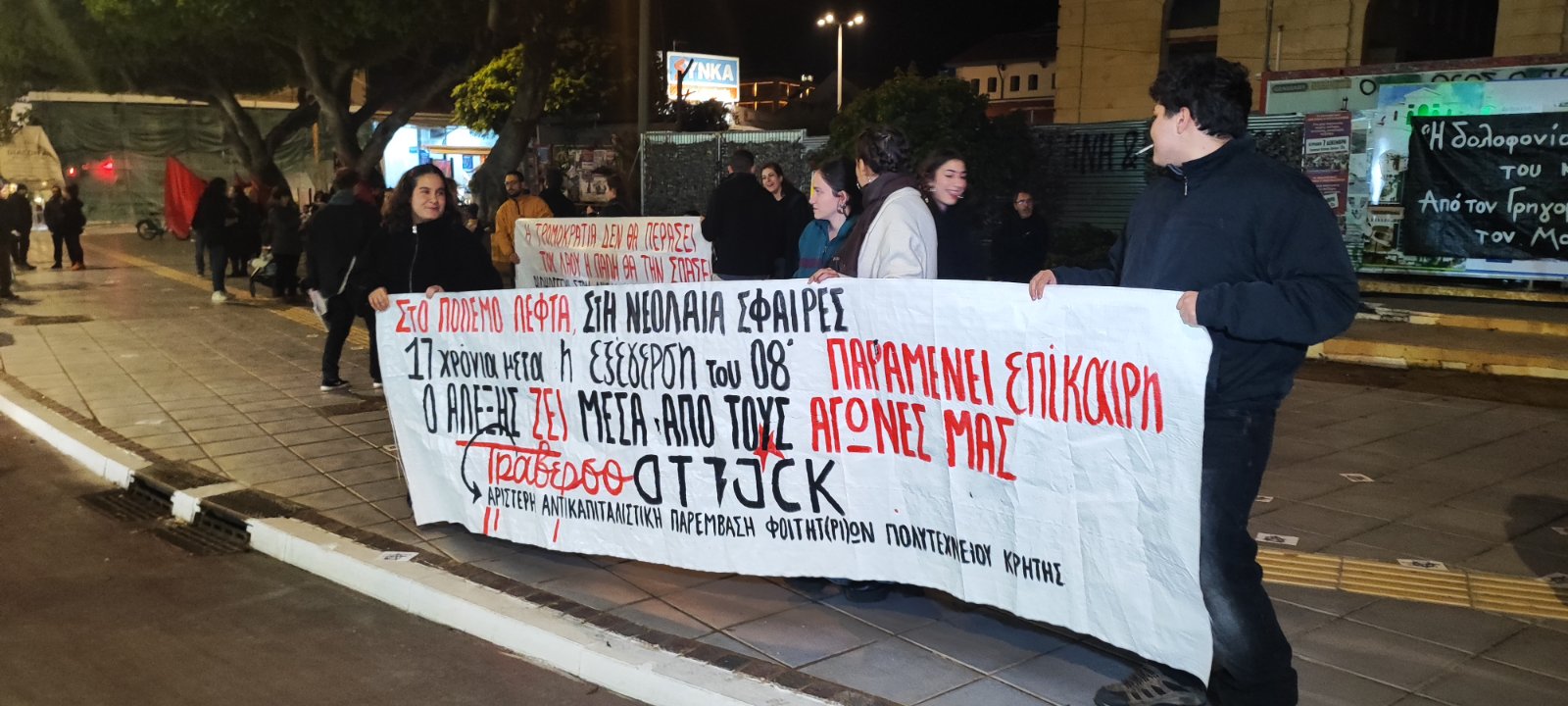 Συγκέντρωση και διαδήλωση για τα 17 χρόνια από τη δολοφονία του Αλέξανδρου Γρηγορόπουλου πραγματοποιήθηκαν στις 6 το απόγευμα του Σαββάτου και στα Χανιά.