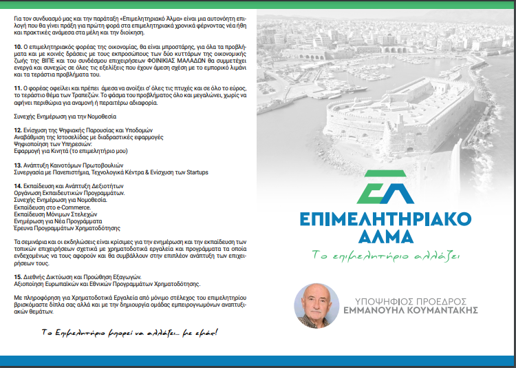 Τις αρχές και τις προτάσεις της για την επόμενη ημέρα στο Επιμελητήριο Ηρακλείου παρουσιάζει μέσα από ένα φυλλάδιο η παράταξη «Επιμελητηριακό Άλμα» του Μανώλη Κουμαντάκη, ενόψει των επικείμενων εκλογών.