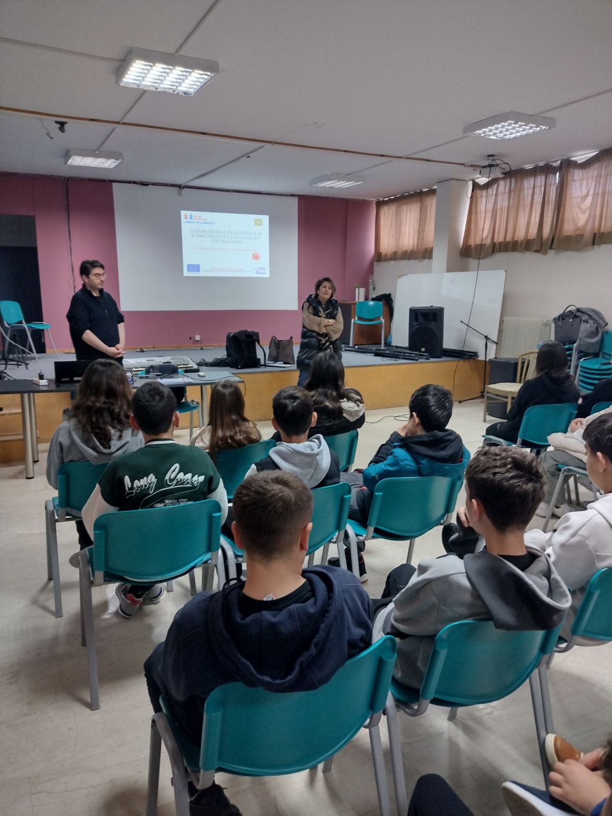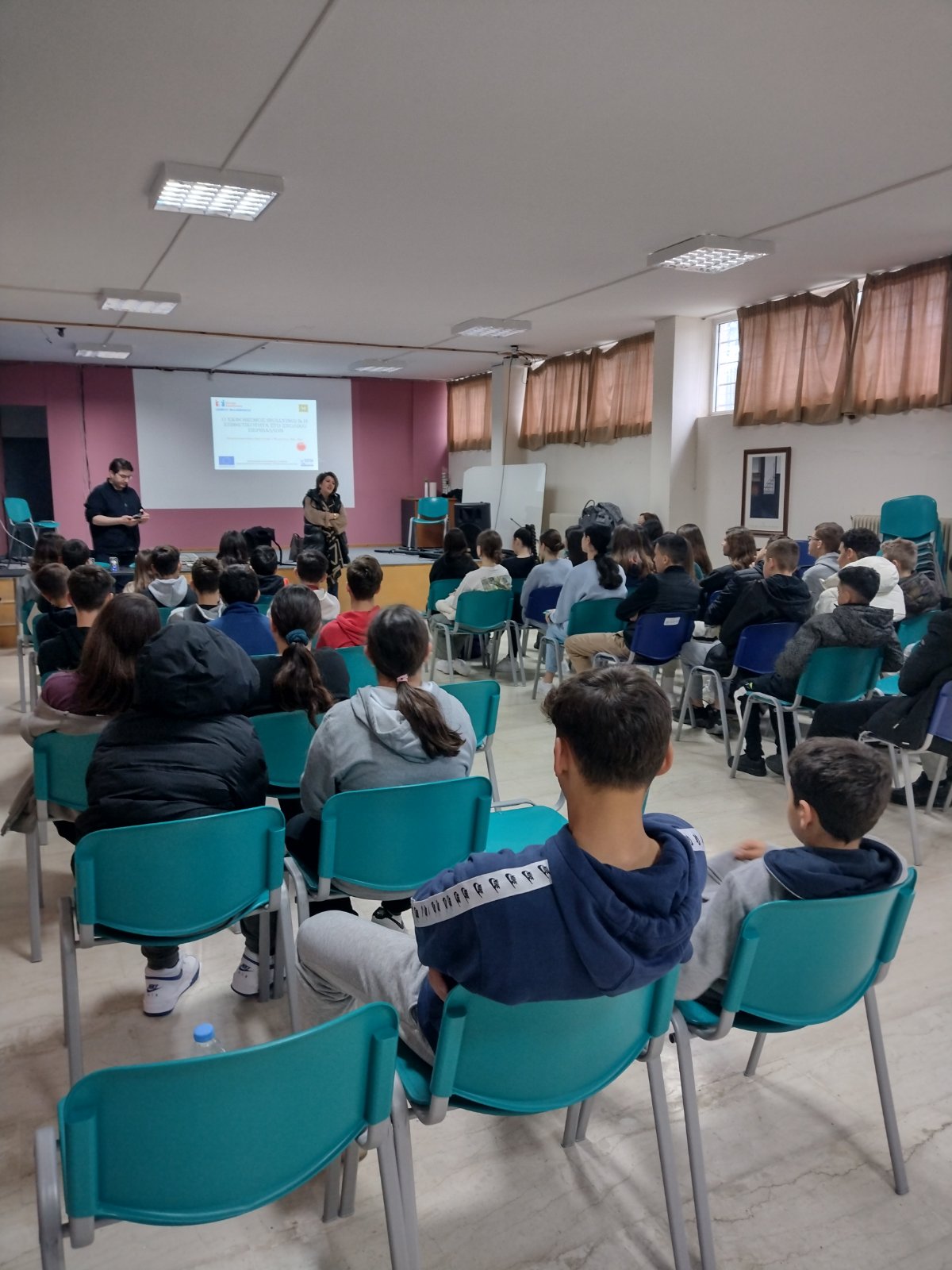 Μετά το καλωσόρισμα από την κ. Βασιλική Ιορδανίδου, εκπαιδευτικό και συντονίστρια δράσης του σχολείου με θέμα «Δεν πειράζω και όταν με πειράζουν, μιλώ!», η κ. Αμαλία Αγγουρίδη συντονίστρια κοινωνική λειτουργός του Κέντρου Κοινότητας ενημέρωσε τους μαθητές και τους συνοδούς καθηγητές για την κοινωνική προστασία που υποστηρίζει το Κέντρο Κοινότητας μέσα από τη συμβουλευτική υποστήριξη και γενικότερα για τις υπηρεσίες της δομής.