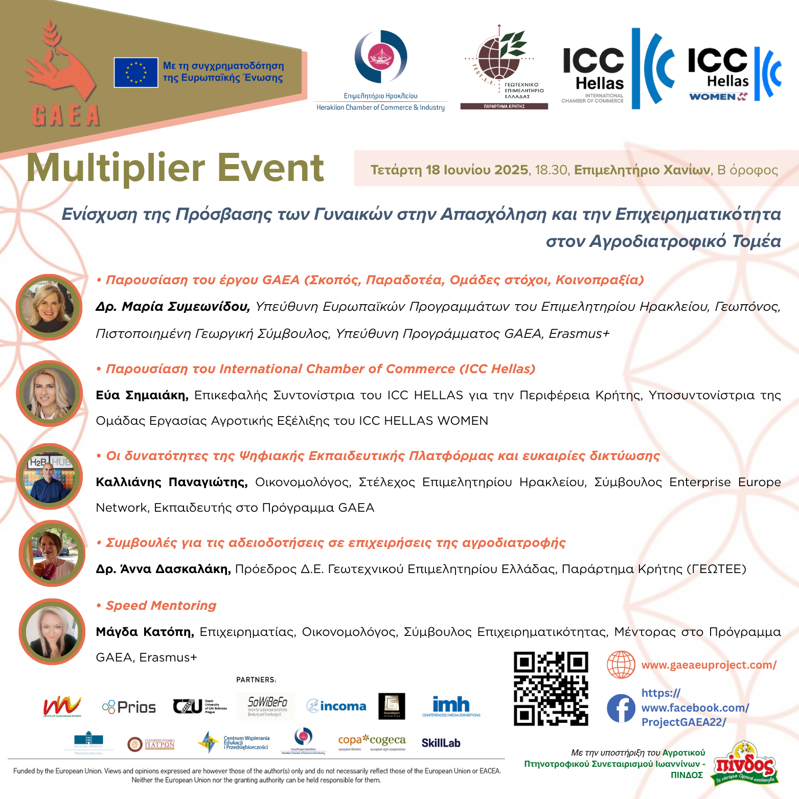 Η εκδήλωση πραγματοποιείται στο πλαίσιο του ευρωπαϊκού έργου GAEA (101056279) στο οποίο συμμετέχει ως εταίρος το Επιμελητήριο Ηρακλείου, με χρηματοδότηση από το πρόγραμμα Alliances for Innovation, Erasmus + Βασική δράση 2: Συνεργασία μεταξύ οργανισμών και ιδρυμάτων.