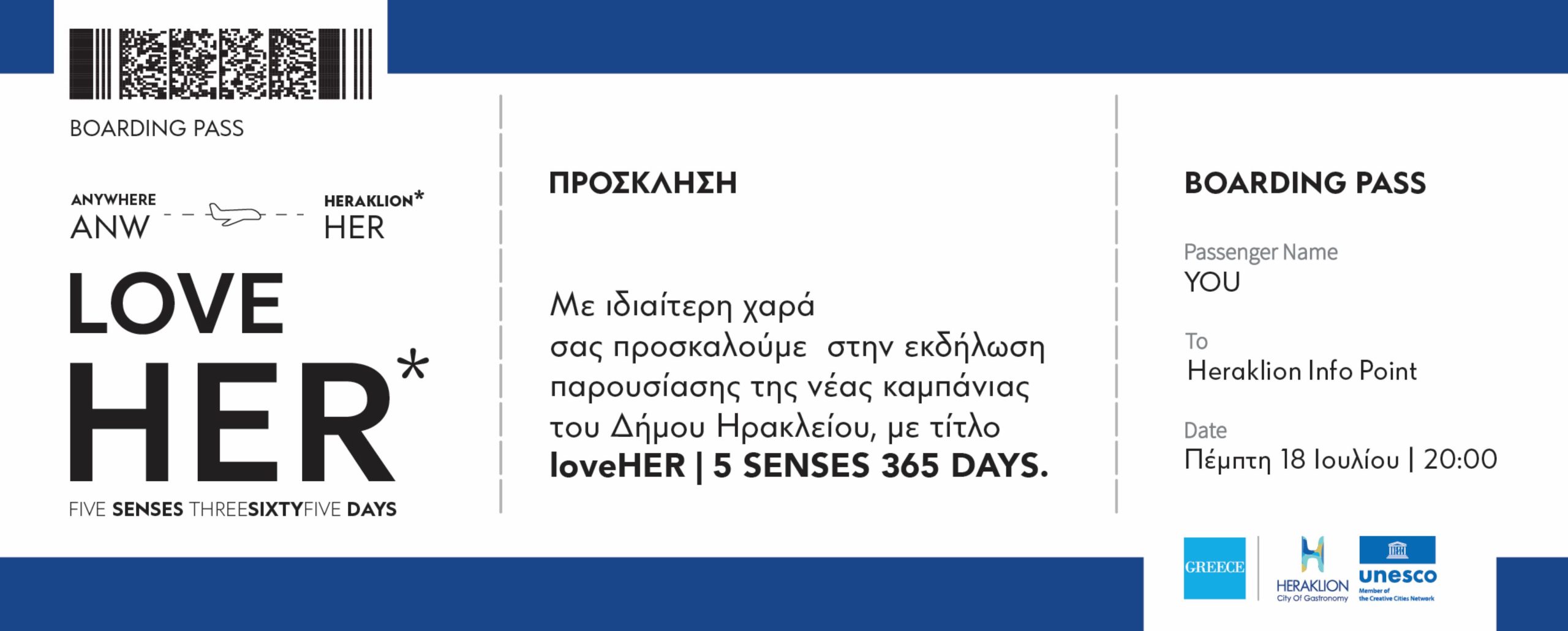 Με κεντρικό μήνυμα «Love HER», Ανακαλύψτε το Ηράκλειο με όλες τις αισθήσεις σας, ένα ταξίδι γεμάτο ιστορία, πολιτισμό και γεύσεις, ο ιδανικός προορισμός για όλο το χρόνο» ο Δήμος Ηρακλείου καλωσορίζει τους επισκέπτες σε ένα μαγευτικό ταξίδι γεμάτο εκπλήξεις και αυθεντικές εμπειρίες. Η καμπάνια loveHER σε προσκαλεί να ανακαλύψεις, να ζήσεις και να αγαπήσεις το Ηράκλειο με όλες σου τις αισθήσεις: Κοιτώντας, Νιώθοντας, Δοκιμάζοντας, Οσφραίνοντας, Ακούγοντας, ή αλλιώς See, Feel, Taste, Smell, Hear.