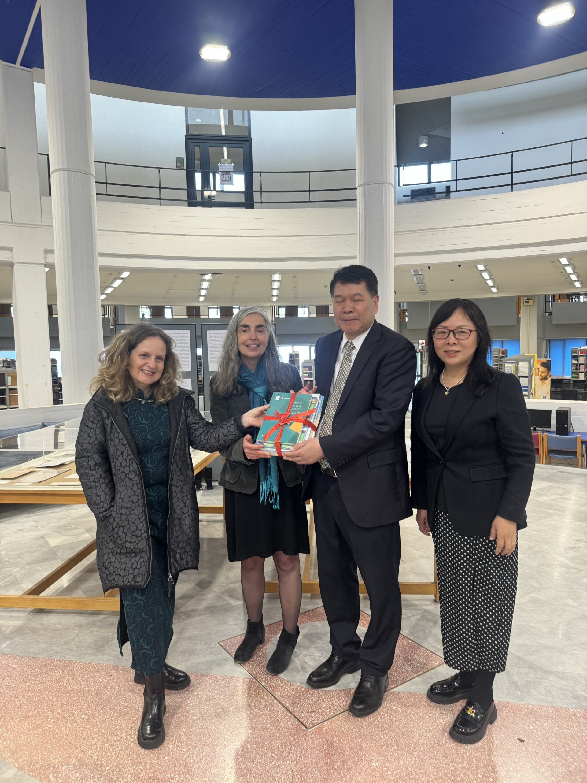 Η επίσκεψη ολοκληρώθηκε με ξενάγηση της κινεζικής αντιπροσωπείας στους χώρους της Βιβλιοθήκης, όπου έγινε ενημέρωση και για τις τρέχουσες θεματικές εκθέσεις. Τέλος, στο πλαίσιο μιας σύντομης τελετής, ανακοινώθηκε η δωρεά 200 κινεζικών βιβλίων σε αγγλική μετάφραση, τα οποία θα εμπλουτίσουν σημαντικά τη συλλογή της Κεντρικής Βιβλιοθήκης του Ιδρύματος, ενθαρρύνοντας τη μελέτη της κινεζικής γλώσσας και του κινεζικού πολιτισμού από τους φοιτητές και εν γένει την ακαδημαϊκή κοινότητα του ιδρύματος.
