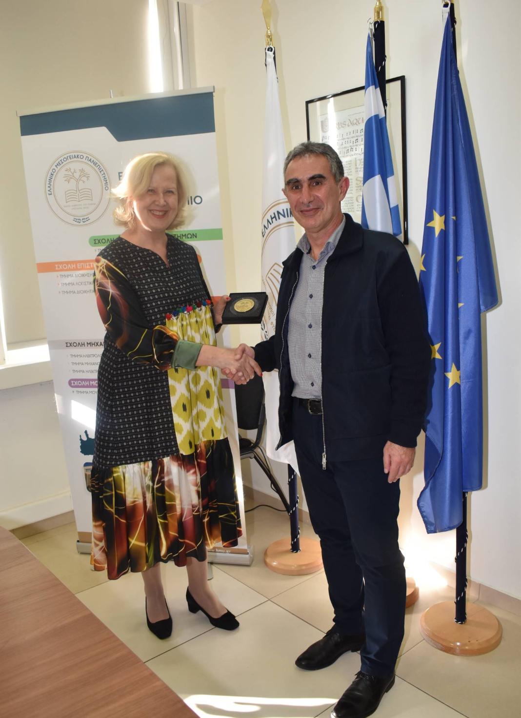 Εθιμοτυπική και ενημερωτική συνάντηση πραγματοποιήθηκε στις 24 Ιανουαρίου 2025 μεταξύ του Πρύτανη του Ελληνικού Μεσογειακού Πανεπιστημίου (ΕΛΜΕΠΑ), Καθ. Νίκου Κατσαράκη και της Επίτιμης Προξένου της Δημοκρατίας της Κένυας στην Ελλάδα, κας Βίκυς Πανταζοπούλου. Κατά τη συνάντηση από πλευράς του ΕΛΜΕΠΑ παραβρέθηκαν ο Αντιπρύτανης Έρευνας και Καινοτομίας, Καθ. Αθανάσιος Μαλάμος, ο Αντιπρύτανης Ακαδημαϊκών Θεμάτων και Διά Βίου Μάθησης, Καθ. Φώτιος Μαυροματάκης και η Εκτελεστική Διευθύντρια, Δρ. Βανέσσα Σημαντηράκη, ενώ παρών ήταν και ο Αντιπεριφερειάρχης Κρήτης για θέματα διασύνδεσης με ερευνητικά και ακαδημαϊκά ιδρύματα, κ. Γιώργος Ματαλλιωτάκης. Την κα Βίκυ Πανταζοπούλου συνόδευε ο κ. Βασίλης Κατσικέας, Πρόεδρος του Ελληνο-Κενυατικού Επιμελητηρίου.