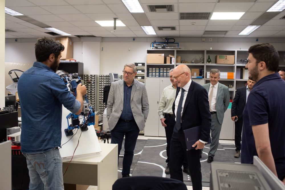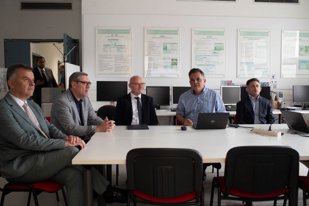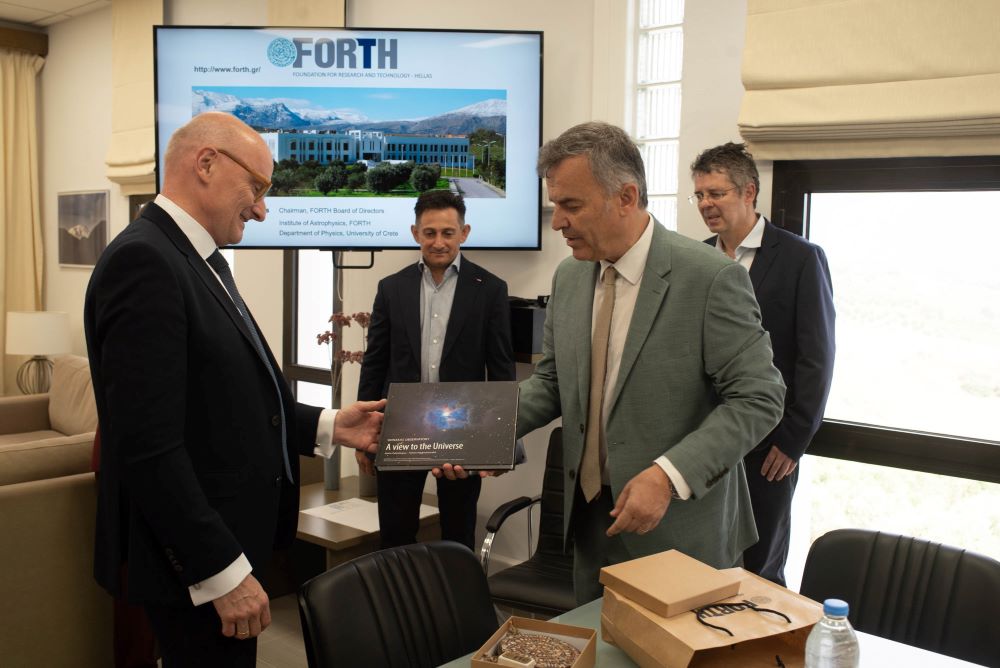 Συναντήθηκαν με τον Πρόεδρο του ΙΤΕ, καθ. Βασίλη Χαρμανδάρη, και τον Αντιπρόεδρο καθ. Δημήτρη Πλεξουσάκη, Διευθυντές των Ινστιτούτων και των Ειδικών Δομών του ΙΤΕ, και ενημερώθηκαν εκτενώς για τις δραστηριότητες του Ιδρύματος και τις πολυετείς συνεργασίες του με σημαντικά εκπαιδευτικά και ακαδημαϊκά Ιδρύματα στη Γερμανία. Χαρακτηριστικό παράδειγμα αποτελεί το Αστεροσκοπείο του Σκίνακα, κύρια ερευνητική υποδομή του Ινστιτούτου Αστροφυσικής, το οποίο ιδρύθηκε το 1984 από το ΙΤΕ, το Πανεπιστήμιο της Κρήτης και το Max-Planck Institute for Extraterrestrische Physik (MPE – Γερμανία), με το οποίο υπάρχει στενή ερευνητική συνεργασία.